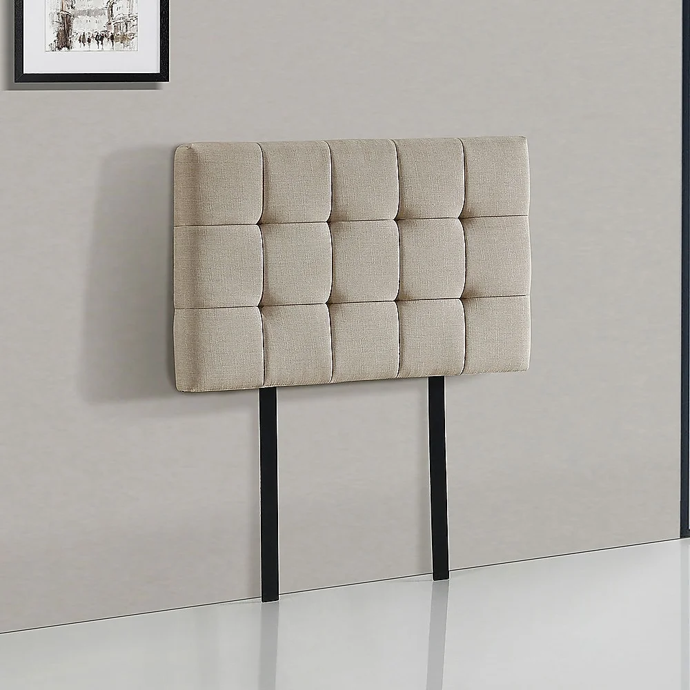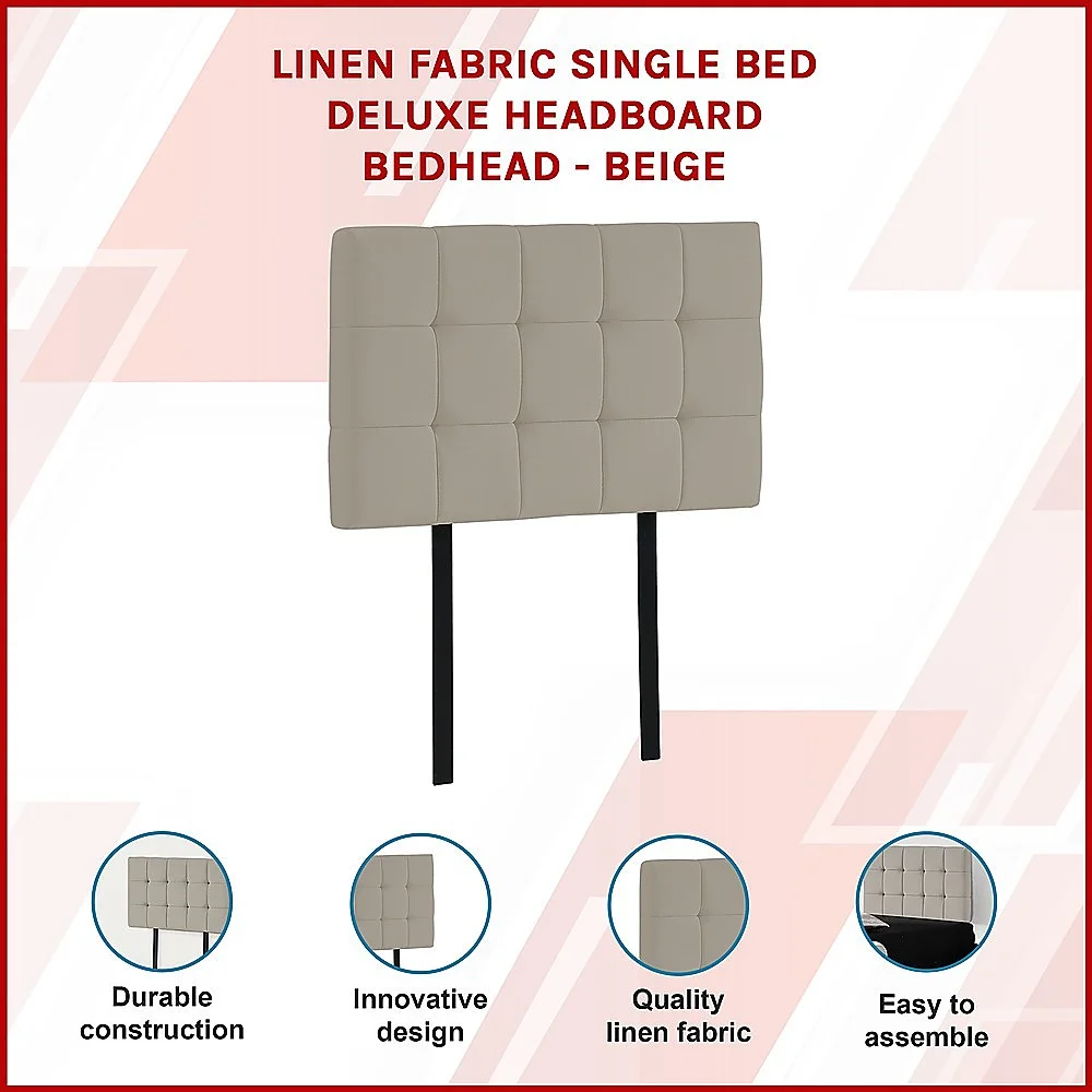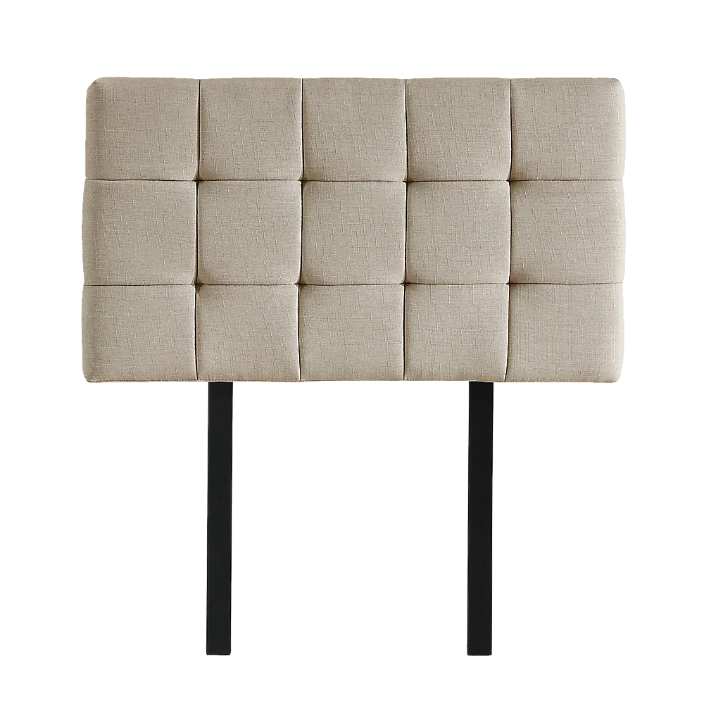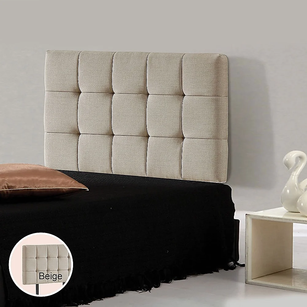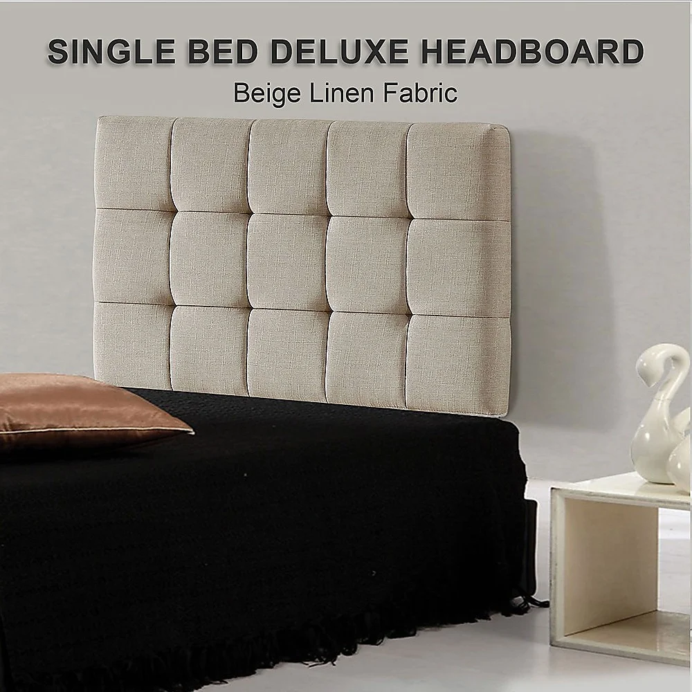 This headboard for standard Single-sized bed frames is created with quality materials, including easy-to-maintain Linen Fabric that will maintain its sophisticated look for many years to come. This particular model comes with elegant stitching accents that provide just the right level of understated pop. A neutral beige will blend seamlessly with a wide variety of bed frames and other bedroom furniture.