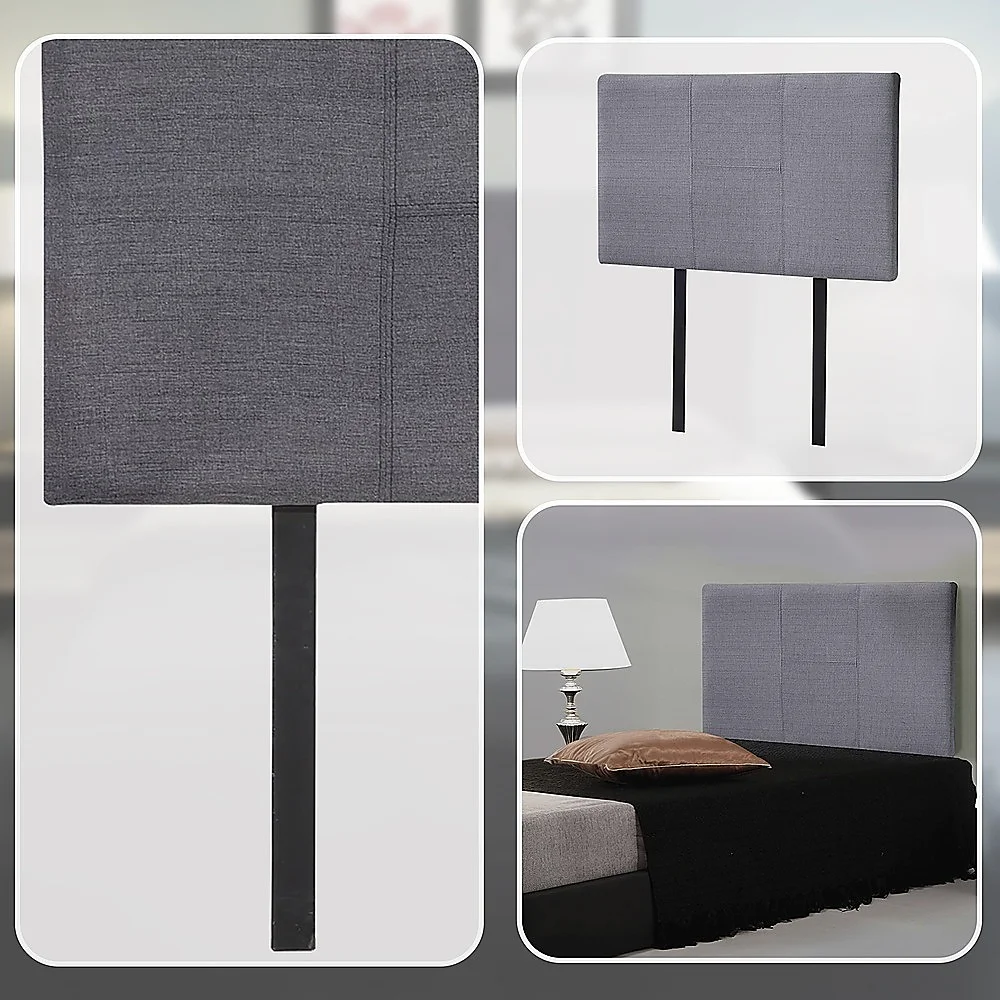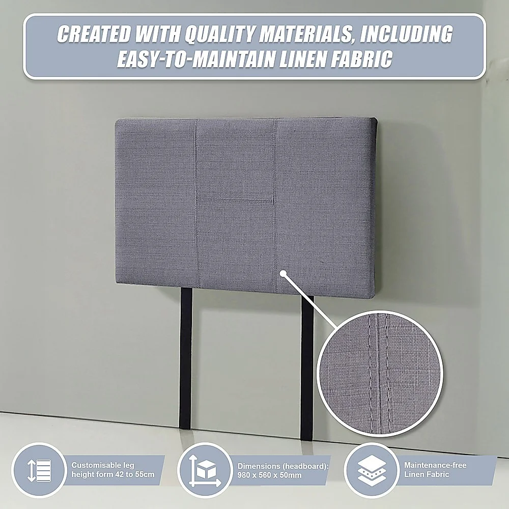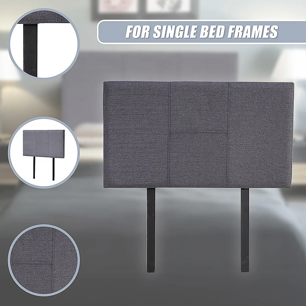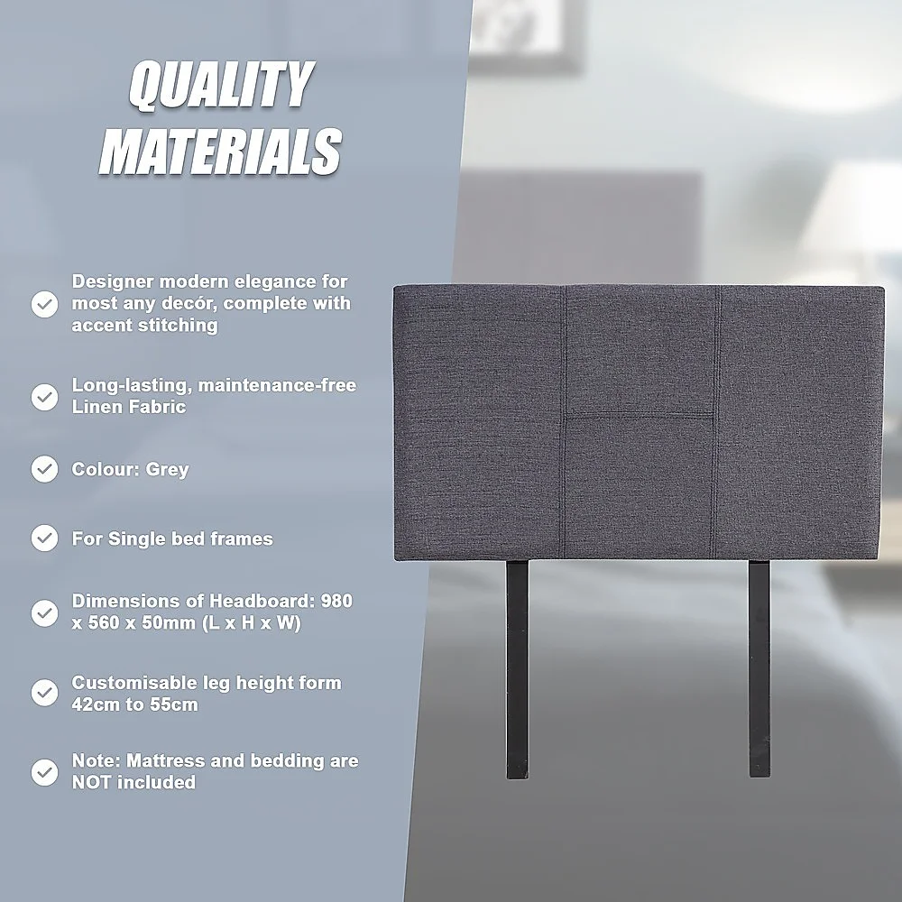 This headboard for standard Single-sized bed frames is created with quality materials, including easy-to-maintain Linen Fabric that will maintain its sophisticated look for many years to come. This particular model comes with elegant stitching accents that provide just the right level of understated pop. A neutral grey will blend seamlessly with a wide variety of bed frames and other bedroom furniture.