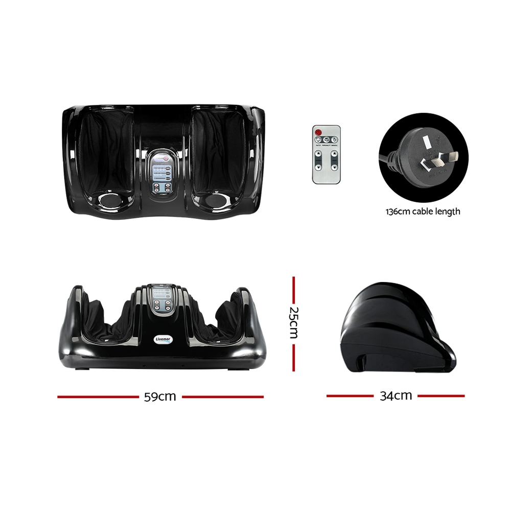 Another long day of walking and standing? Feel that you need a good massage to rejuvenate the senses, particularly the legs, calves and feet? Well, you can have those soothing massages in the comfort of your own home (or practically anywhere where a power point is available) with the Livemor Foot Massager. Setting up the massage is easy with the simple-to-use control panel where you can customize your favourite rub downs in terms of pressure and speed. And with the remote control, you can just sit back and operate from there without any hassles. Not least, the Foot Massager shuts off automatically after 15 minutes to prevent any hurt or injury to your body. Easy to clean with a zippered washable fabric liner, the Foot Massager is also easy to carry with its handy carry handles. So don’t let the aches and pains weigh you down. Get yourself the Livemor Foot Massager and experience relaxing comfort anytime, anywhere. Attention: The foot massager may interfere with the operation of a cardiac pacemaker. Not recommended for use persons with cardiac pacemakers. Features * Two powerful motors * Simple-to-use control panel * Automatic and manual control system * 15-minute auto shut-off * 3 levels of intensity * Squeezes and massages * In-built roller * Flexible air-pressure kneading pads * Comes with remote control * Portable carry handles * Zipper washable fabric liner Specifications * Brand: Livemor * Power: 48W * Voltage: 220-240V; 50/60Hz * Rated worKing time: 15 minutes * Cable length: 136cm * Overall dimension: 59 x 34 x 25 cm * Colour: Black Package Content 1 x Livemor Foot Massager 1 x Remote Control 1 x User Manual