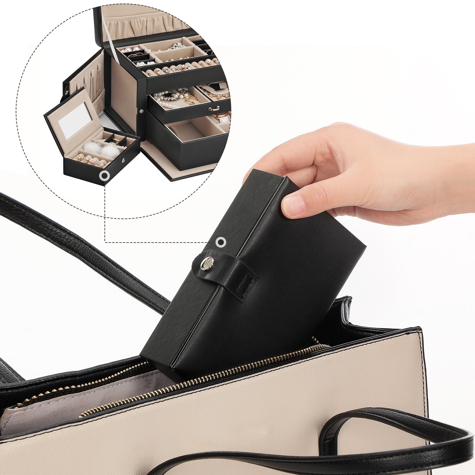 Lockable Jewelry Box 3-Tier Display Case This item stands out for the following characteristics: Show off your jewellery collection with pride. Keep your earrings, bracelets, and rings safe and organized with a beautiful jewellery box. The perfect way to protect your precious pieces, this jewellery box is designed to keep your jewels looking their best. This 26 x 18 x 17 cm jewellery case is the perfect solution for keeping your accessories organised and tangle-free. It features two drawers, two side doors for necklaces and plenty of storage compartments for rings and other accessories, so you can quickly find what you need and get ready in no time. Bring your beauty essentials with you wherever you go with this mini travel case. Featuring a large mirror, ideal for makeup application on the go, this petite case is perfect for a weekend away – simply pop it in your bag and you’re ready to go. Customized to Your Taste: Featuring a simple yet stylish design, this jewelry case is an ideal present for enthusiasts of jewelry and accessories. The recipient’s eyes will light up with delight upon setting eyes on it. Key features: Item Dimensions: 43 x 42 x 31 cm. Item weight: 9.6 kg. Package Dimensions: 45 x 44 x 33 cm. Package weight: 9.6 kg. The box includes the product, all its components, and a simple set of instructions. One product per package.