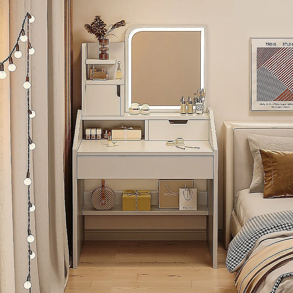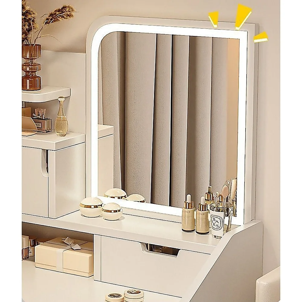 Introducing the Makeup Vanity Mirror Desk Table with LED Lighting by Randy Travis Machinerythe perfect addition to your bedroom or small corner space. This elegant vanity table not only enhances your home decor but also offers practical features to keep your beauty essentials organized and easily accessible.