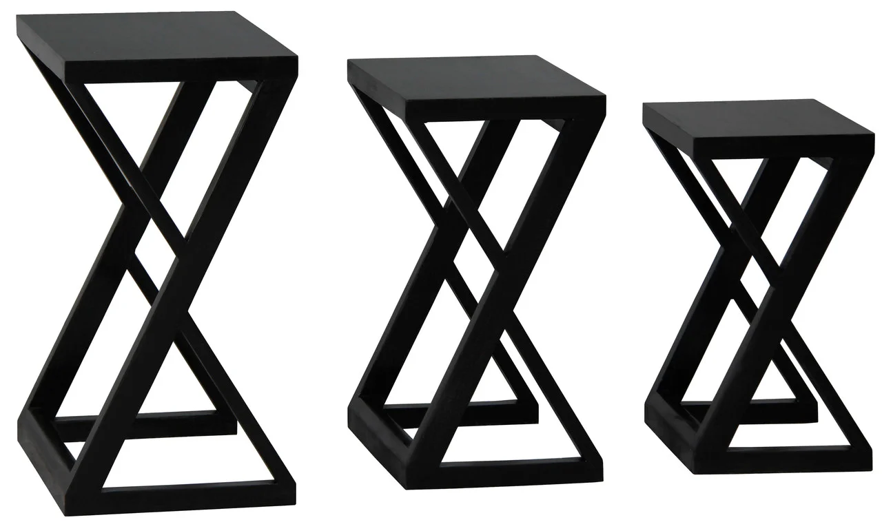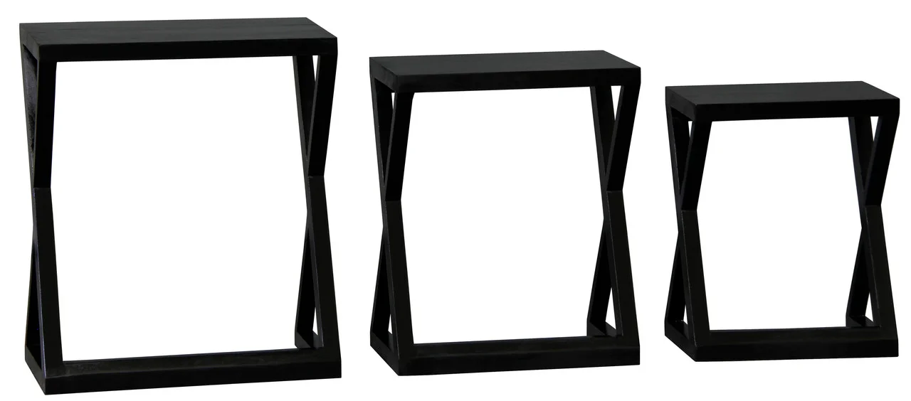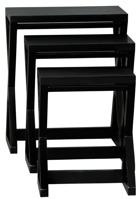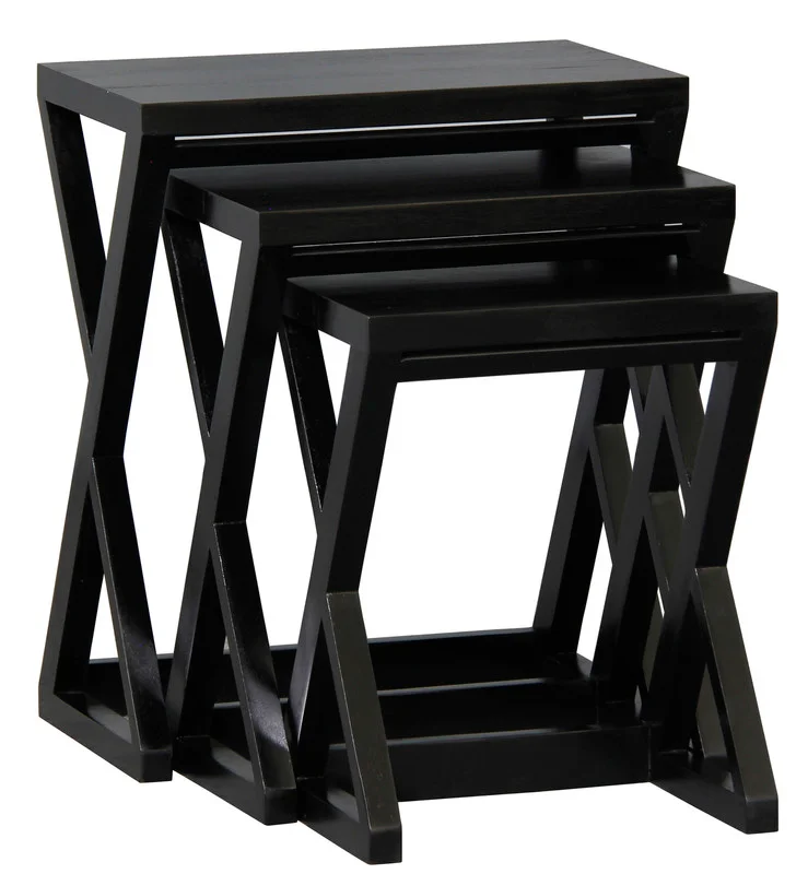 Introducing the Manhattan Nest of Tables, a striking set of three that combines contemporary design with the enduring beauty of solid mahogany timber, now available in an elegant black finish. These tables are more than functional pieces; they are a testament to modern elegance and sophisticated craftsmanship. The Manhattan Nest of Tables features a unique, angular design that sets them apart from conventional nesting tables. The sleek lines and geometric forms create a visually captivating effect, making these tables a bold statement piece for any interior. The rich, satin black finish adds a touch of luxury and refinement, perfectly complementing modern and minimalist decor styles. Each table in the set is thoughtfully designed to nest seamlessly within the other, offering versatile functionality while saving space when not in use. The solid mahogany construction ensures durability and stability, promising that these tables will remain a stylish part of your home for years to come. Whether used together as a coordinated set or individually throughout your living space, the Manhattan Nest of Tables provides ample surface area for your needs. They are perfect for displaying decorative items, serving as side tables, or providing additional space for entertaining guests. Arriving fully assembled, these tables are ready to enhance your home immediately. Their sophisticated design and high-quality craftsmanship make them an ideal choice for those who appreciate the finer things in life.
