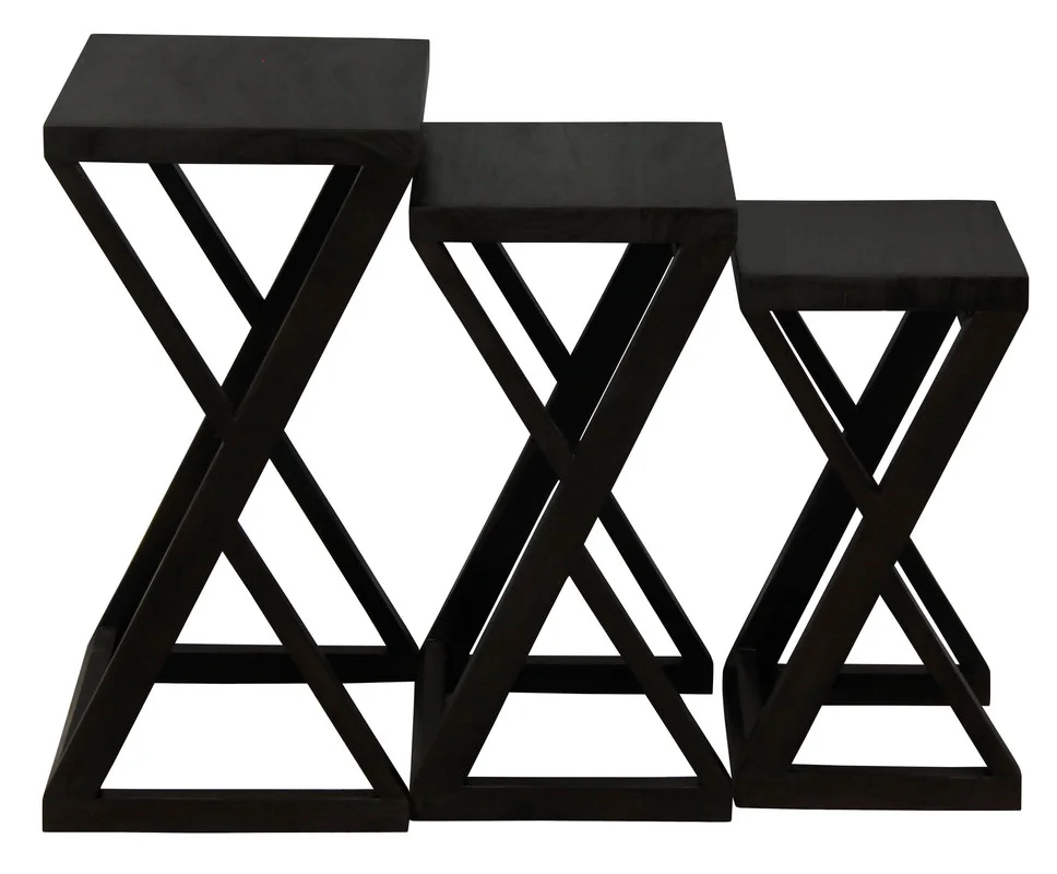 Introducing the Manhattan Nest of Tables, a striking set of three that combines contemporary design with the enduring beauty of solid mahogany timber, now available in a luxurious chocolate color. These tables are more than functional pieces; they are a testament to modern elegance and sophisticated craftsmanship. The Manhattan Nest of Tables features a unique, angular design that sets them apart from conventional nesting tables. The sleek lines and geometric forms create a visually captivating effect, making these tables a bold statement piece for any interior. The rich, satin chocolate finish, a very dark brown, adds a touch of luxury and refinement, perfectly complementing modern and minimalist decor styles. This exquisite brown color is further enhanced when positioned in direct light, bringing out the depth and warmth of the finish. Each table in the set is thoughtfully designed to nest seamlessly within the other, offering versatile functionality while saving space when not in use. The solid mahogany construction ensures durability and stability, promising that these tables will remain a stylish part of your home for years to come. Whether used together as a coordinated set or individually throughout your living space, the Manhattan Nest of Tables provides ample surface area for your needs. They are perfect for displaying decorative items, serving as side tables, or providing additional space for entertaining guests. Arriving fully assembled, these tables are ready to enhance your home immediately. Their sophisticated design and high-quality craftsmanship make them an ideal choice for those who appreciate the finer things in life.