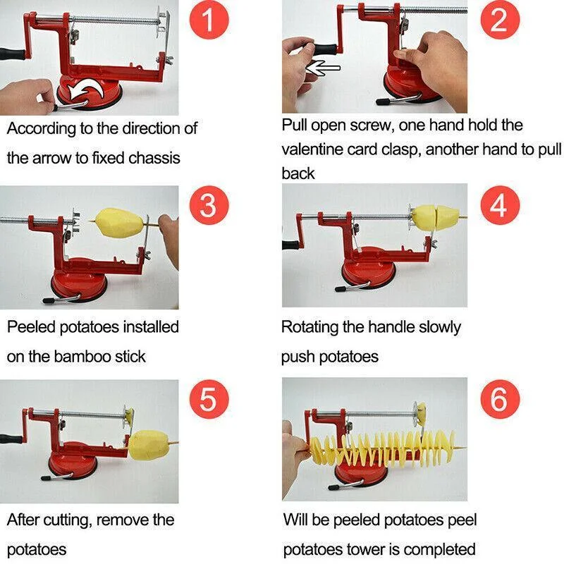 Manual Spiral Potato Slicer:Features a high-quality aluminium alloy frame and ergonomic crank, enabling smooth spiral cutting of potatoes, carrots, or fruits.