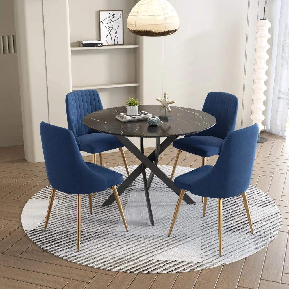 Want to have a comfortable and super atmosphere dining environment? This dining chair set includes a marble dining chair and four elegant and retro velvet dining chairs, which are luxurious and low-key. It is a dining chair set worth getting started with.