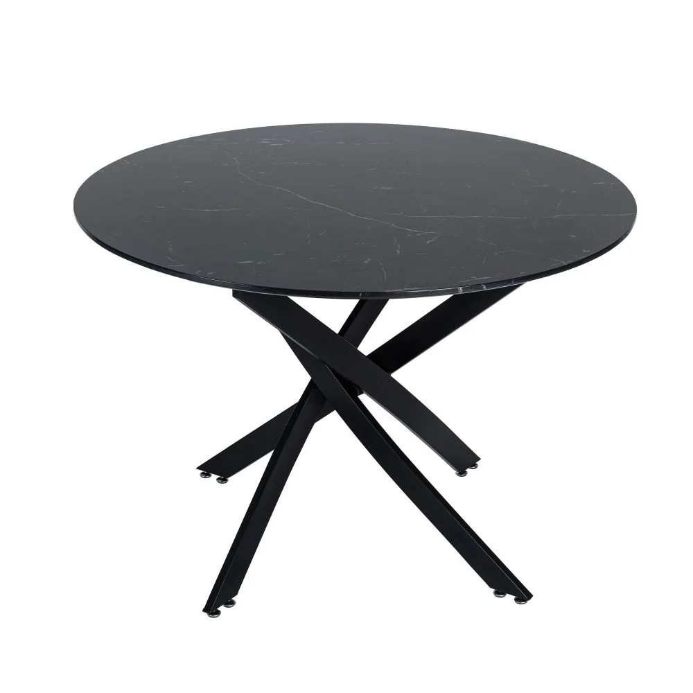 This table is made of solid MDF desktop, which is painted with elegant black marble design with white texture. This table is 110cm in diameter and can comfortably accommodate 4 people. The 20mm thick table top keeps it slim, but it is strong enough to hold all your favorite dishes.