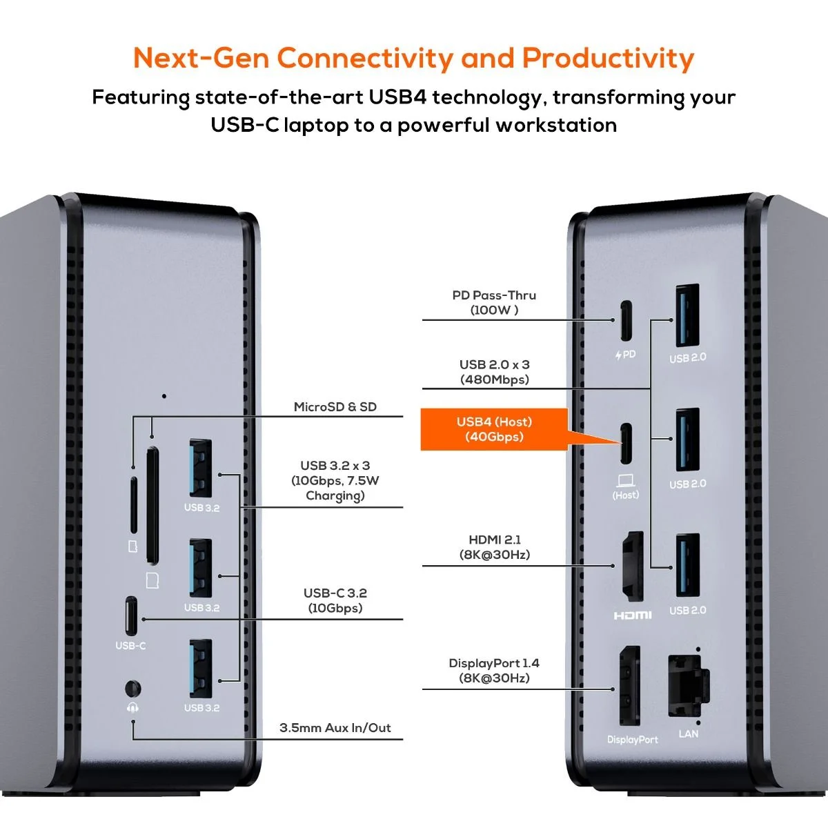 Featuring dual display via HDMI 2.1 and DP1.4, 100W PD pass-through, RJ45 1000Mbps, SD/MicroSD reader, 3xUSB3.2 with BC1.2 fast charge, 3xUSB2.0, 1xType-C and Hi-Res 3.5 AUX.