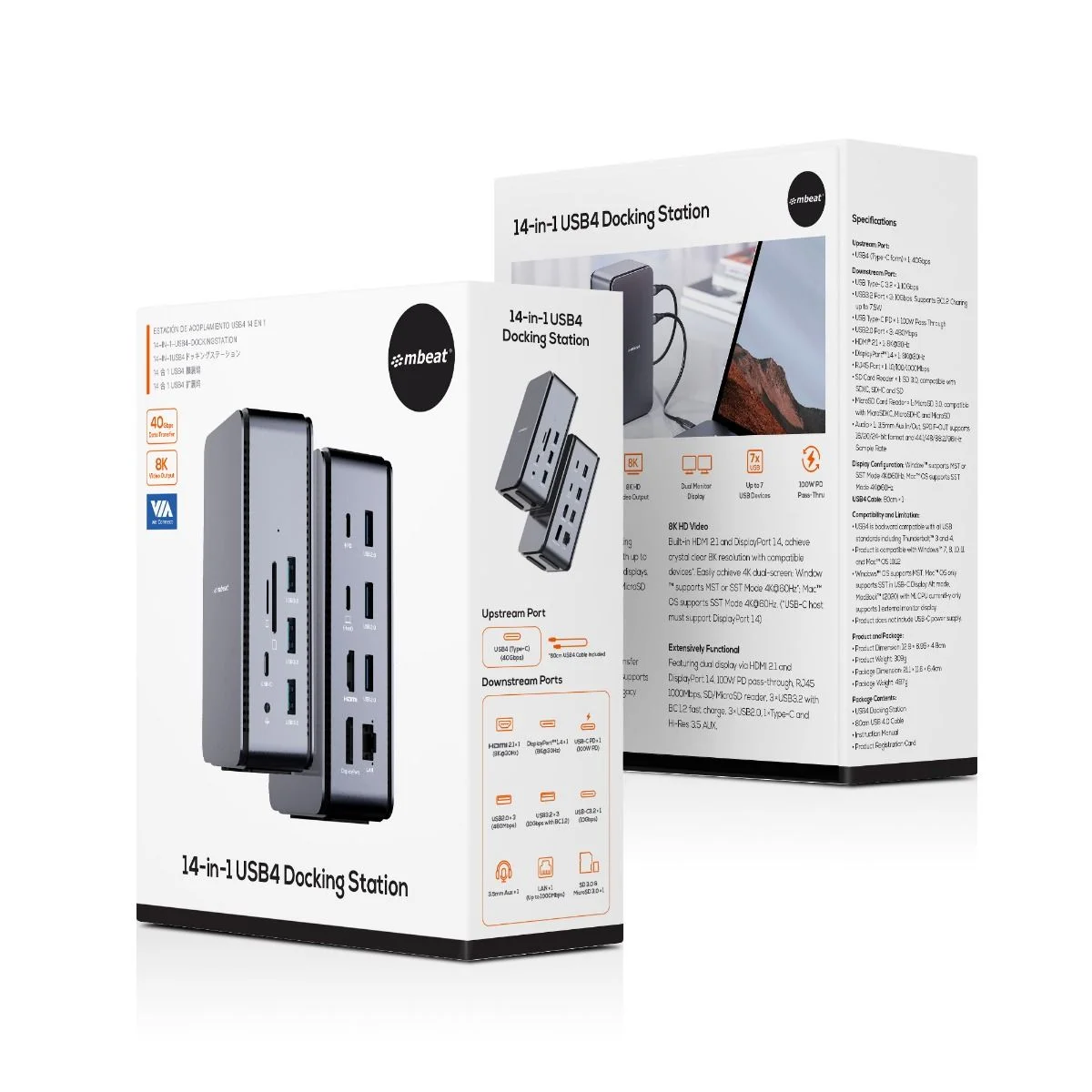 Premiere 14-port all-in-one USB4 docking station with up to 40Gbps bandwidth; connect dual UHD displays, up to 7 USB devices, Gigabit LAN, SD/MicroSD 3.0 cards, Hi-Res audio with 100W PD Pass-through.