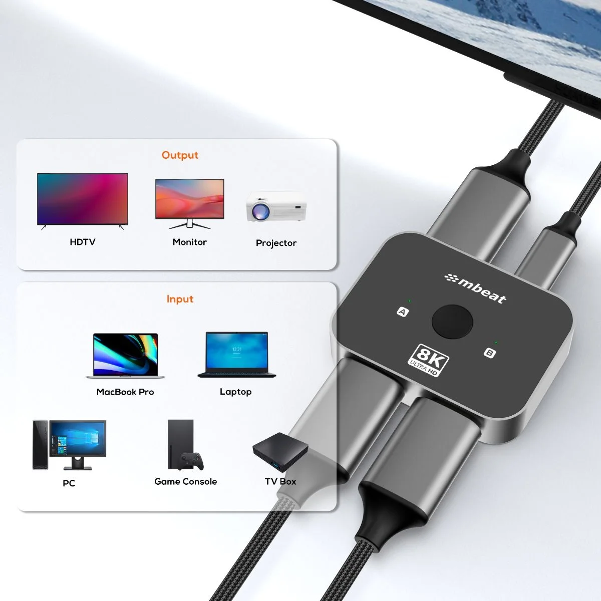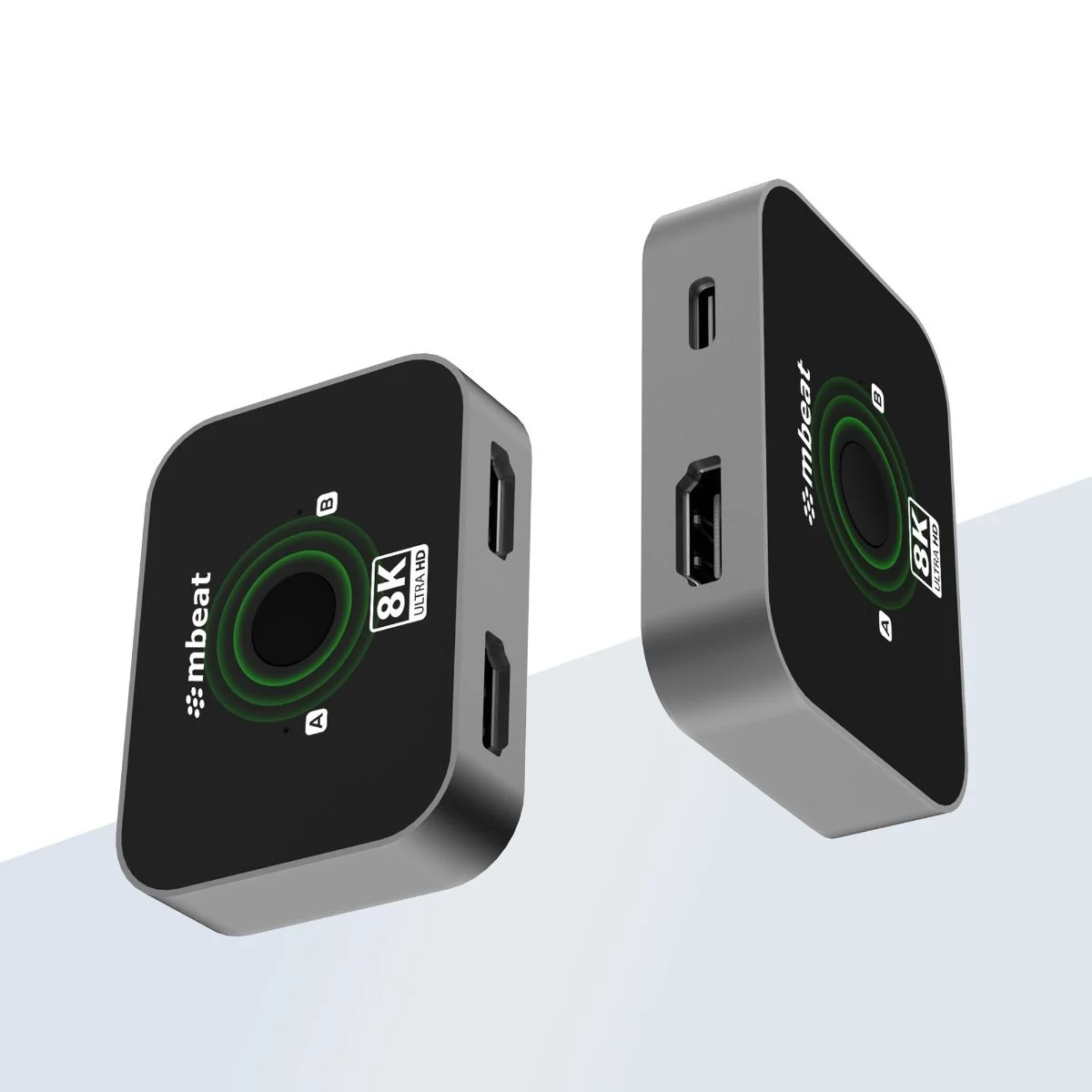 Introducing the mbeat 8K Bi-directional HDMI 2.1 Switch 2 In 1 Out / 1 In 2 Out. Switch between two HDMI sources and one display, or one source and two displays effortlessly. Enjoy up to 8K@60Hz resolution, plug-and-play convenience, and durable aluminium construction. Includes USB-C power input for stable signal transmission.