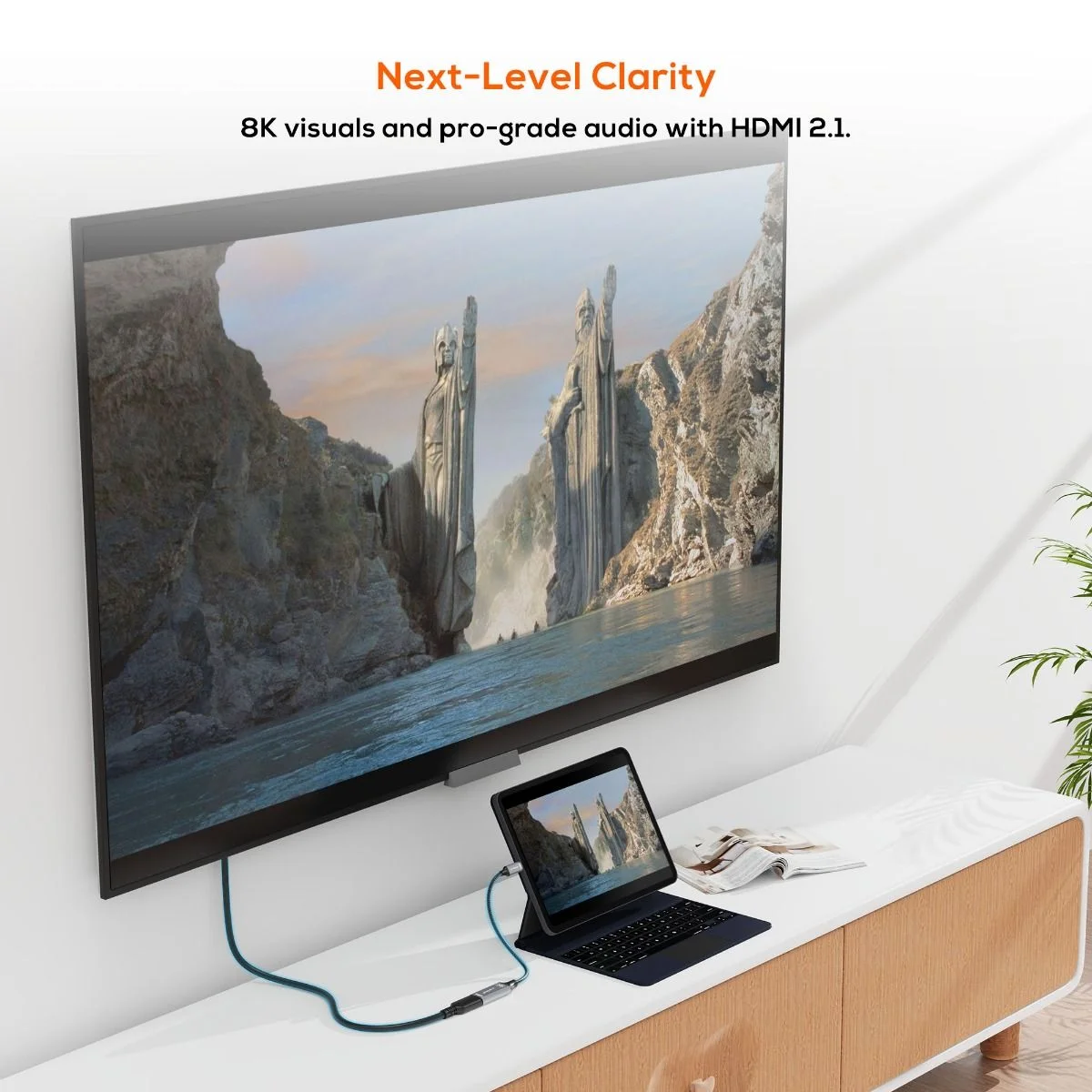 The mbeat Tough Link 8K USB-C to HDMI Adapter supports 8K@60Hz, multi-screen functionality, and smooth video with HDMI 2.1. It features a durable nylon cable, gold-plated connectors, and broad compatibility with USB-C and Thunderbolt devices.