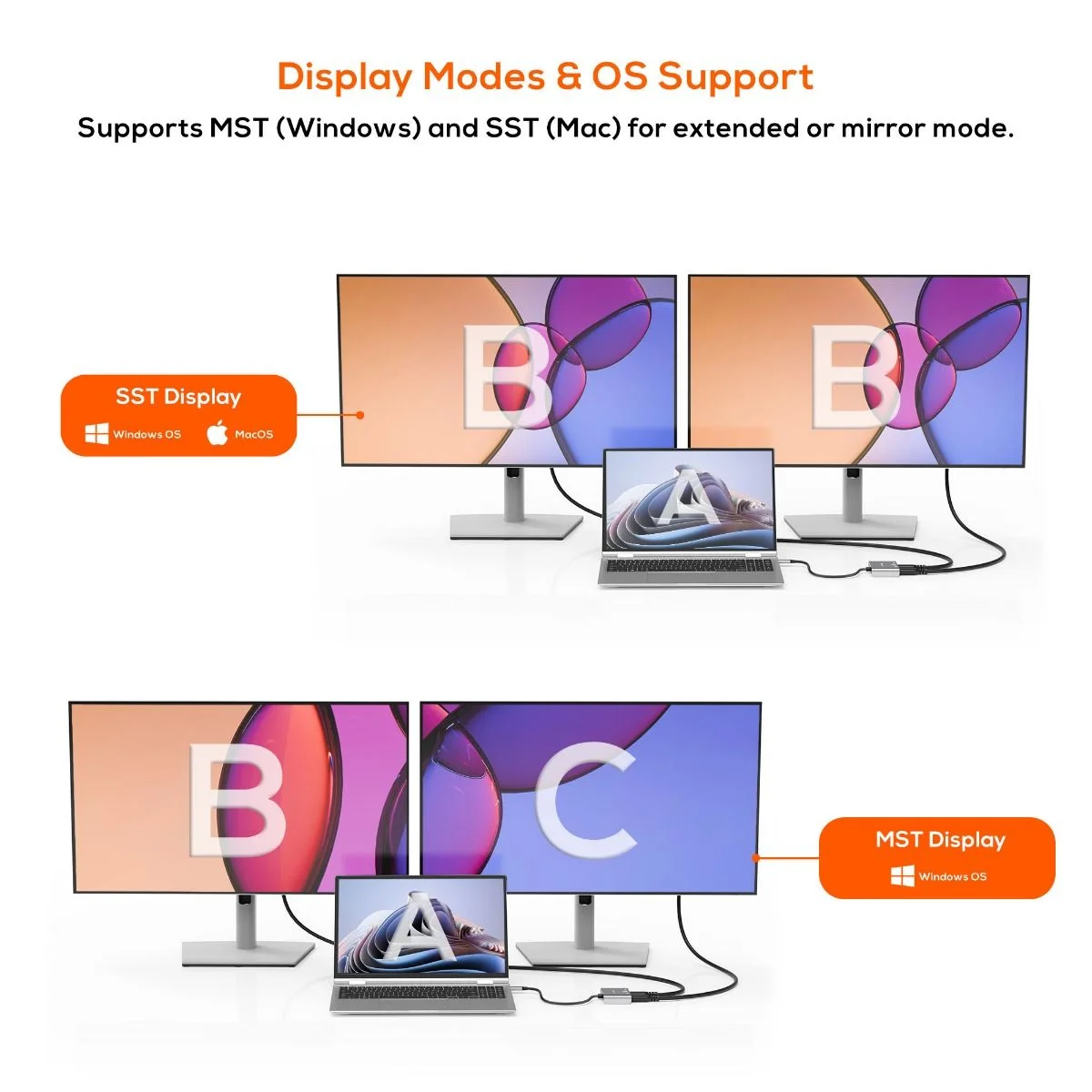 Enhance multitasking with extended or mirror display modes. The adapter supports MST (Multi-Stream Transport) on Windows OS for multiple independent displays and SST (Single-Stream Transport) on macOS, where mirrored displays are standard.
