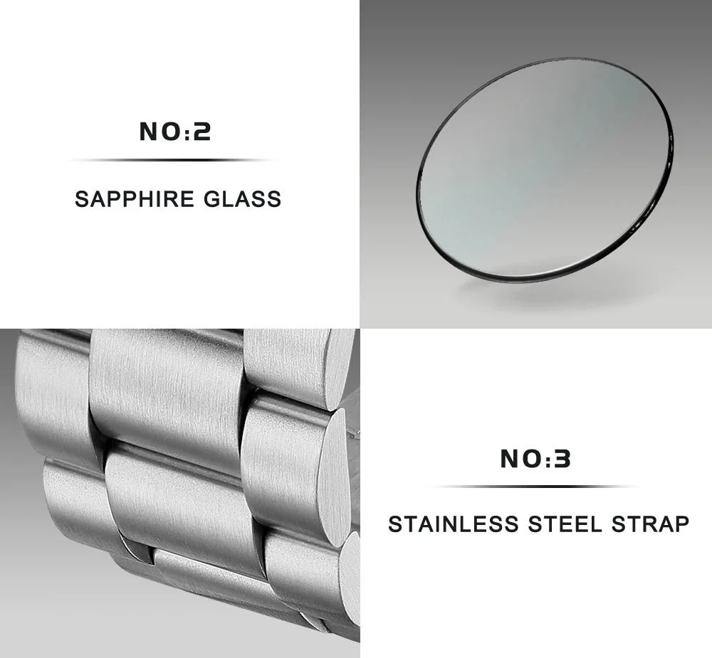 Luxury stainless steel watch with chronograph, luminous hands, and sapphire crystal dial.