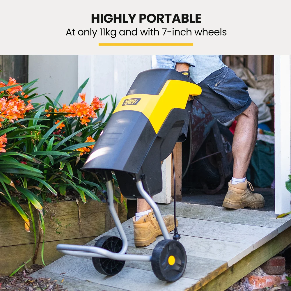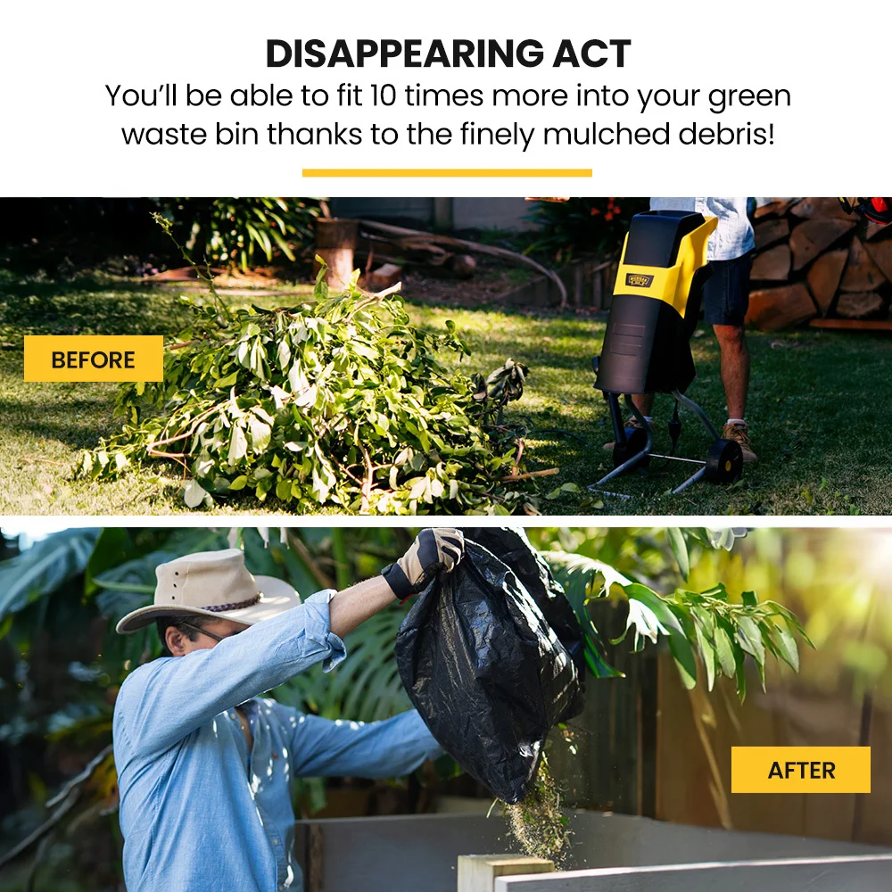 Why would you consider a petrol powered chipper when this powerful high torque 2400W electric motor delivers the continuous shredding power to devour bushy materials and branches of up to 40mm in diameter! It's certainly easy being green with one button start, and of course, no fuelling hassles or fumes!