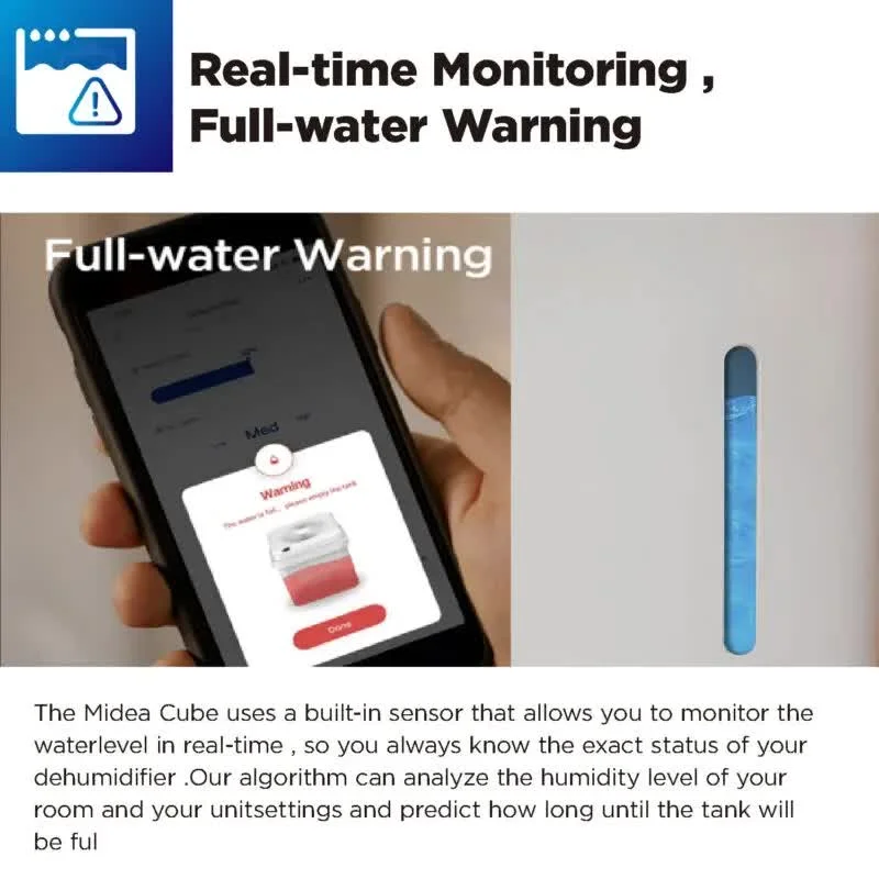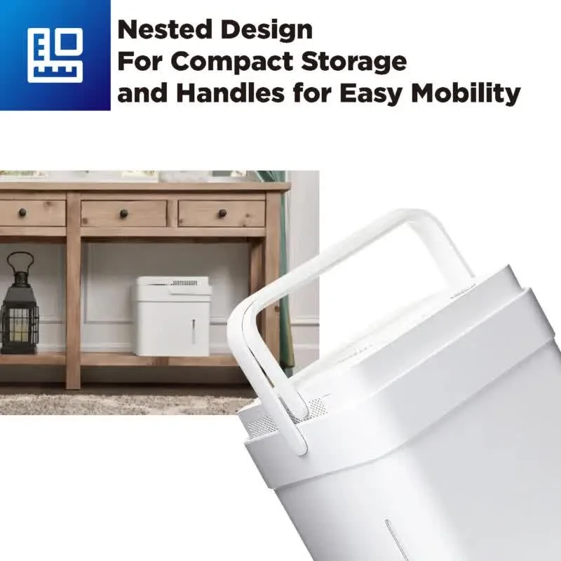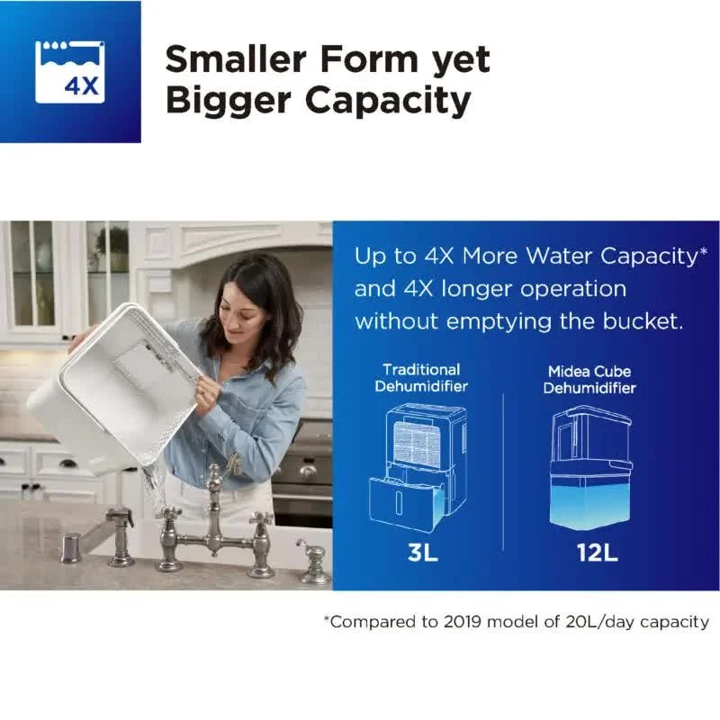 The Midea Cube dehumidifier has a unique lift-and-twist design that offers unparalleled flexibility: when operating in extended form, it has up to 3 times more water tank capacity than traditional dehumidifiers and can run much longer without the hassle of frequently emptying the tank; when in nested or drain form, the unit is half the size allowing compact storage or flexible draining.