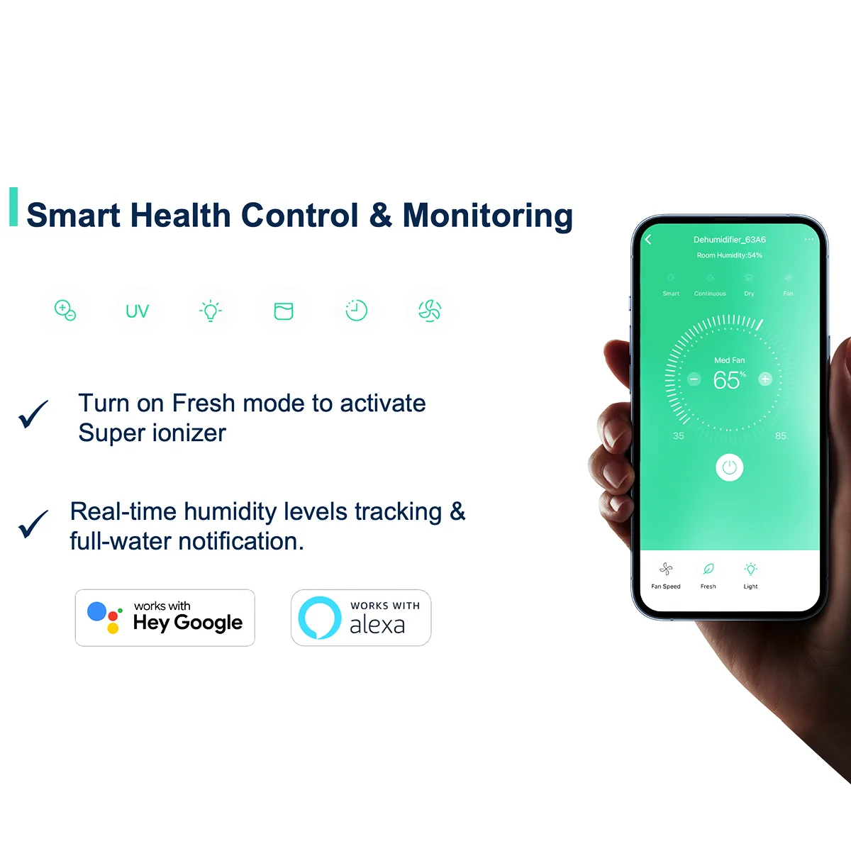 - Automatically control room humidity in a comfortable range of 45%-55% according to room
