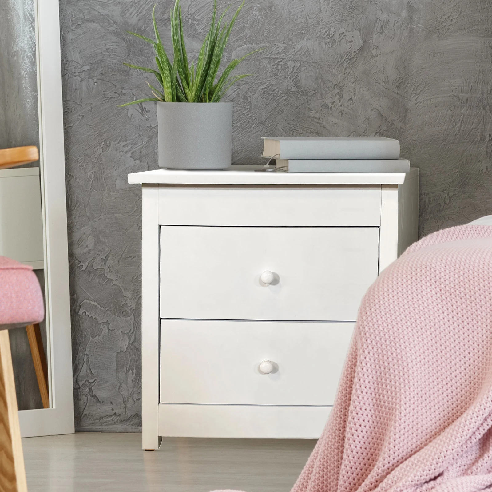 This white bedside table features 2 drawers for holding essentials close to hand, and the top surface can be dressed to suit your desired setting.