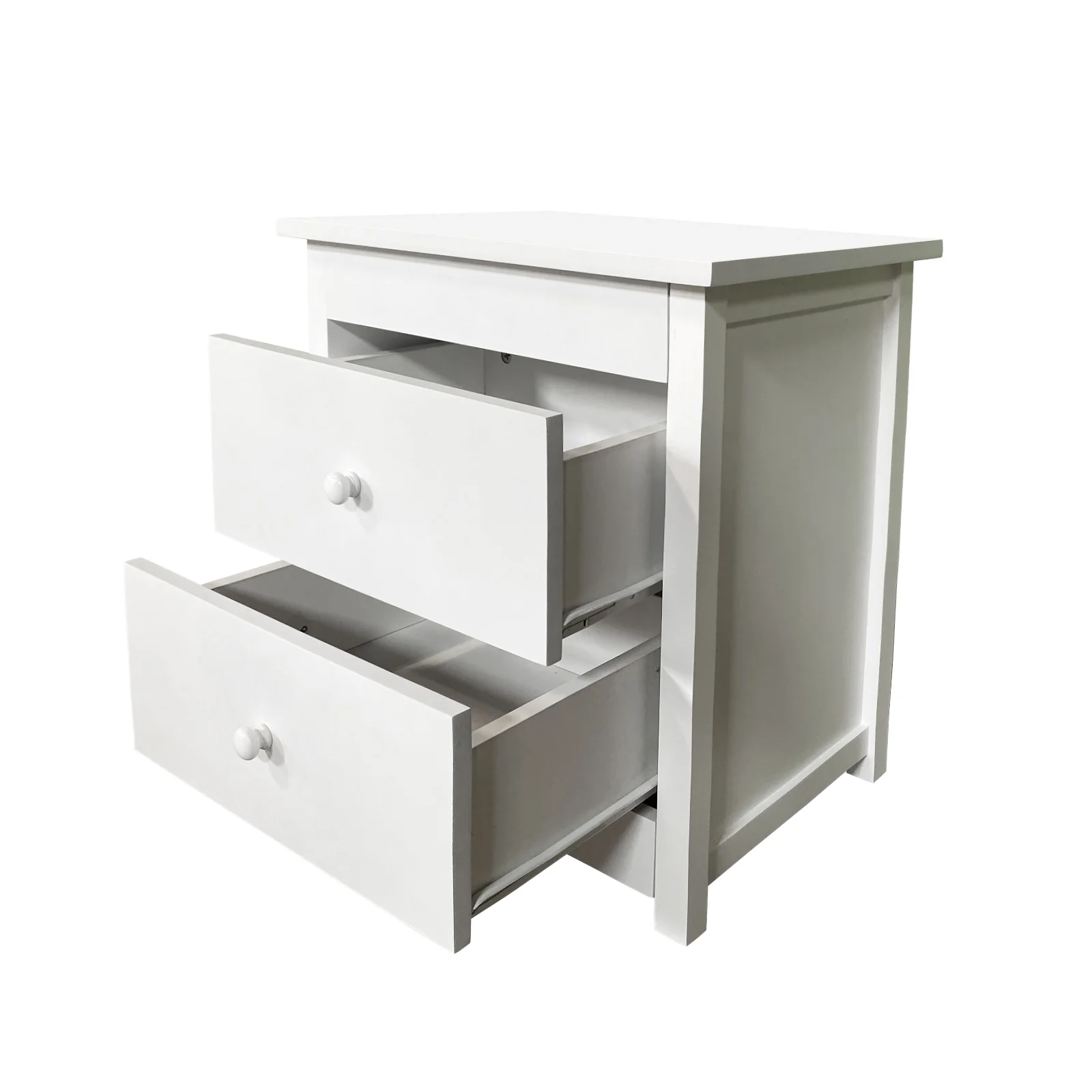 This bedside table includes two table drawers that open and close smoothly for extra storage, white matching handles to match any room and colour theme.