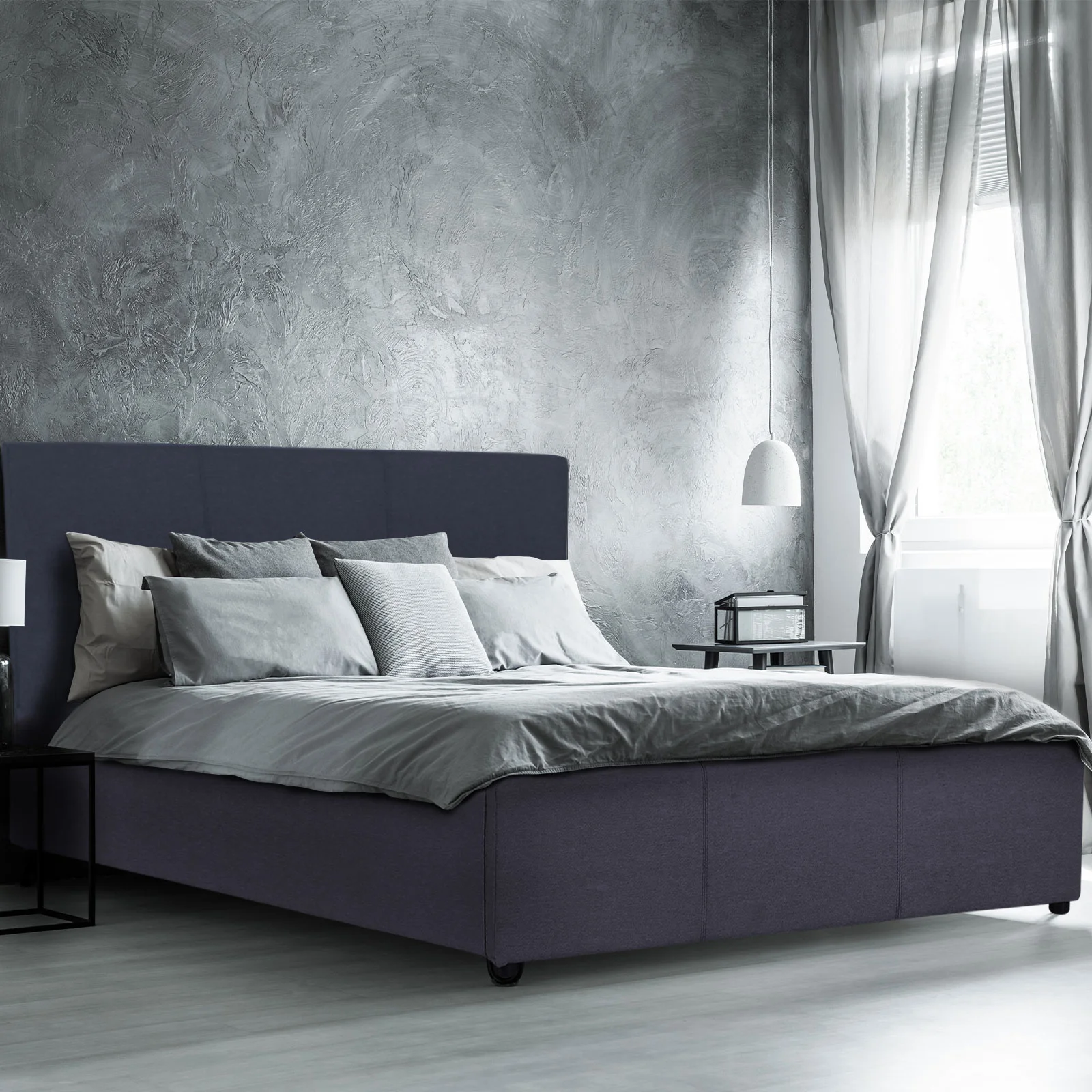 This bed frame and the complementary headboard is encased in a high-quality fabric upholstery with clean and smooth edges that complement the modern design and adds another layer of comfort to the bedroom experience.