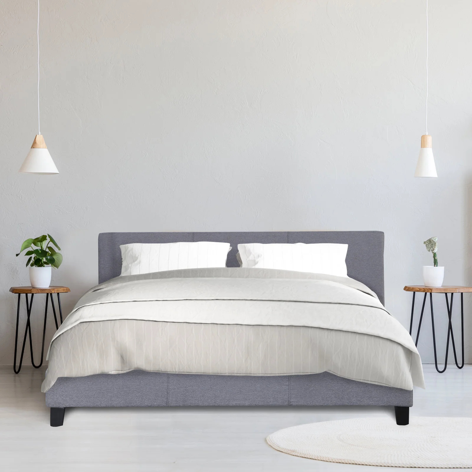 This bed frame and the complementary headboard is encased in a high-quality fabric upholstery with clean and smooth edges that complement the modern design and adds another layer of comfort to the bedroom experience.