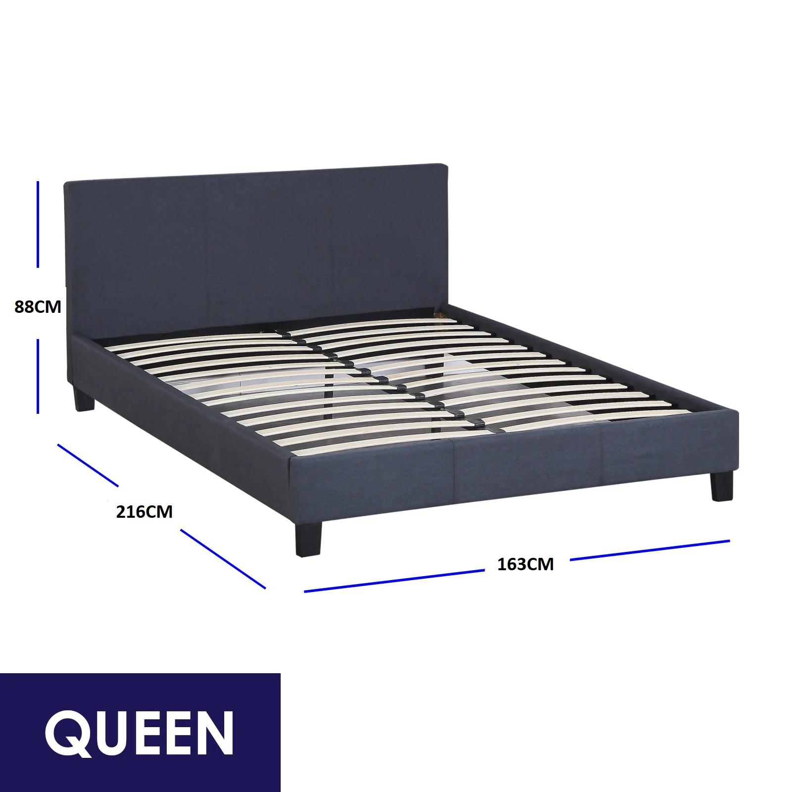 This bed frame and the complementary headboard is encased in a high-quality fabric upholstery with clean and smooth edges that complement the modern design and adds another layer of comfort to the bedroom experience.