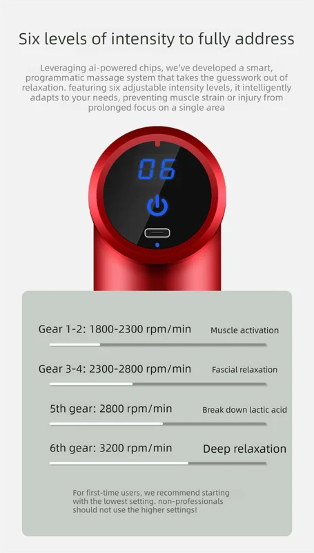 Don't let muscle pain slow you down. This Mini Massage Gun is designed to bridge the gap between professional therapy and daily convenience. The upgraded LCD screen adds a touch of modern sophistication, making it intuitive to check your intensity level at a glance. Despite its small stature, the high-torque motor delivers powerful percussion therapy (6mm amplitude) deep into the fascia to release knots and improve circulation.