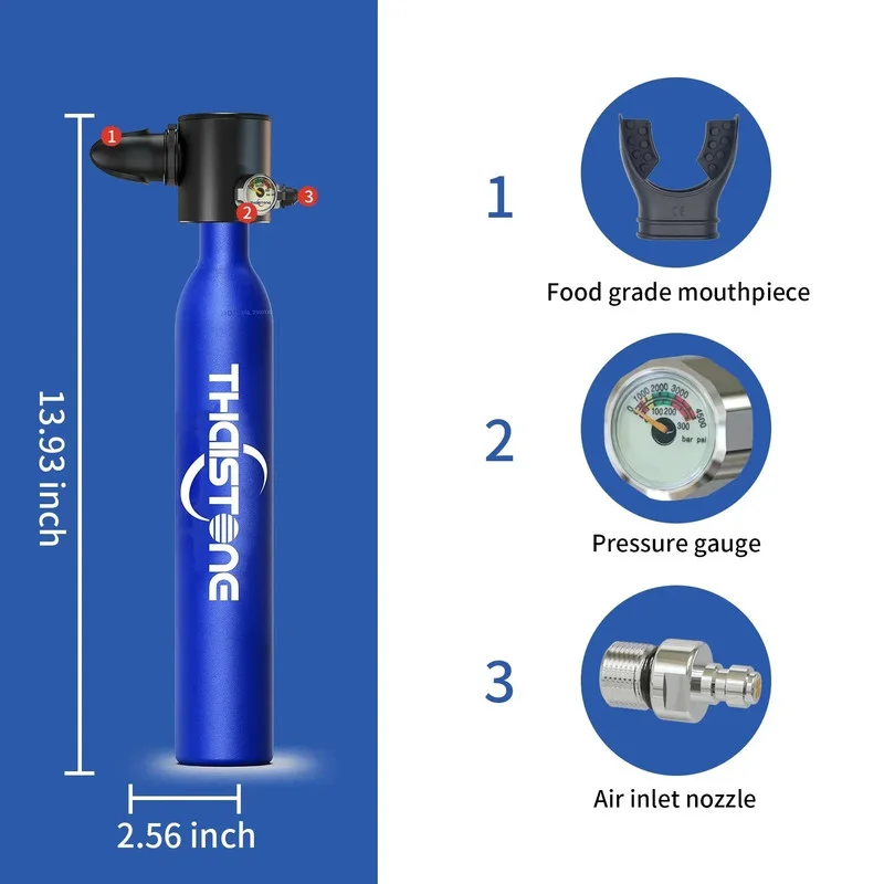 Compact Dive Companion: The 0.5L oxygen cylinder allows you to dive 1-10 meters underwater for 5-12 minutes, making it ideal for beginners and short dives.