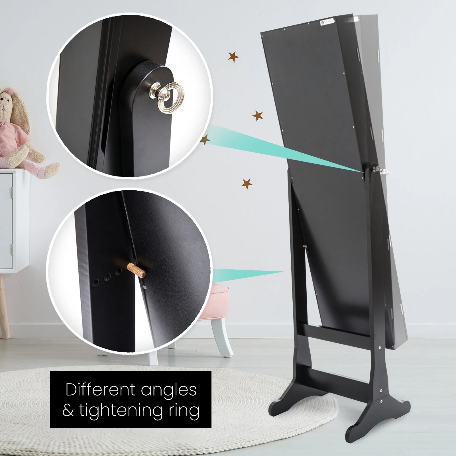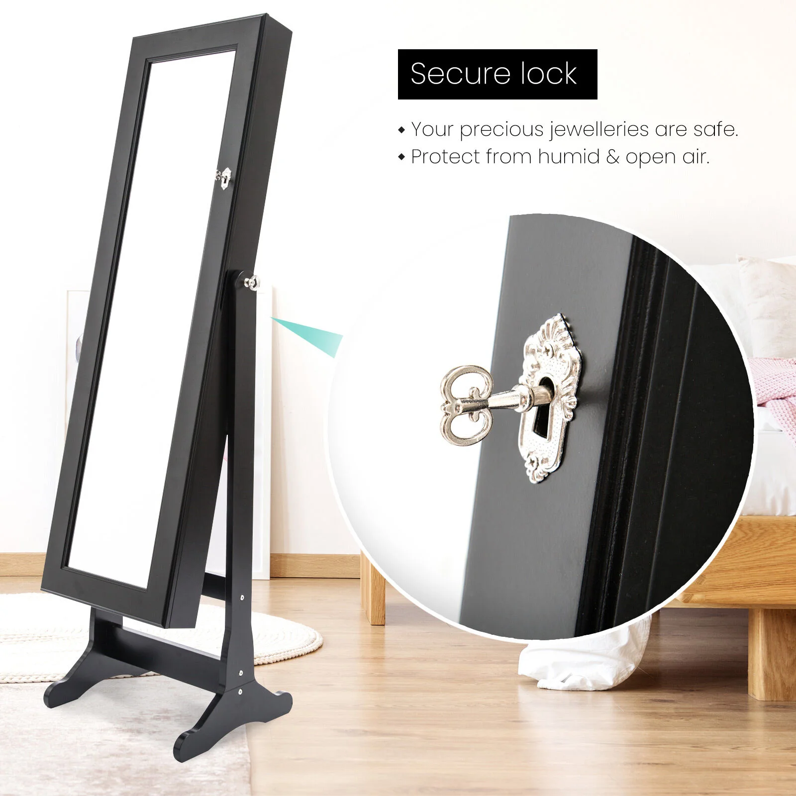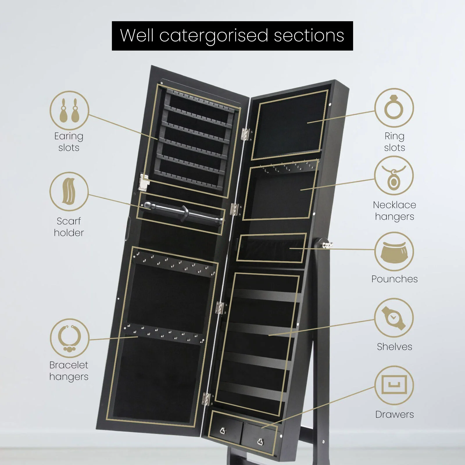 There are many earring hangers, necklace hooks, ring slots, and shelves to make it easier to separate and organise your precious jewelleries. You can certainly find many ways to arrange your accessories so you will be able to find a perfect way only for yourself! The black flock-lined interior will give your shiny jewelleries a nice contrast and under light, it will look even better!