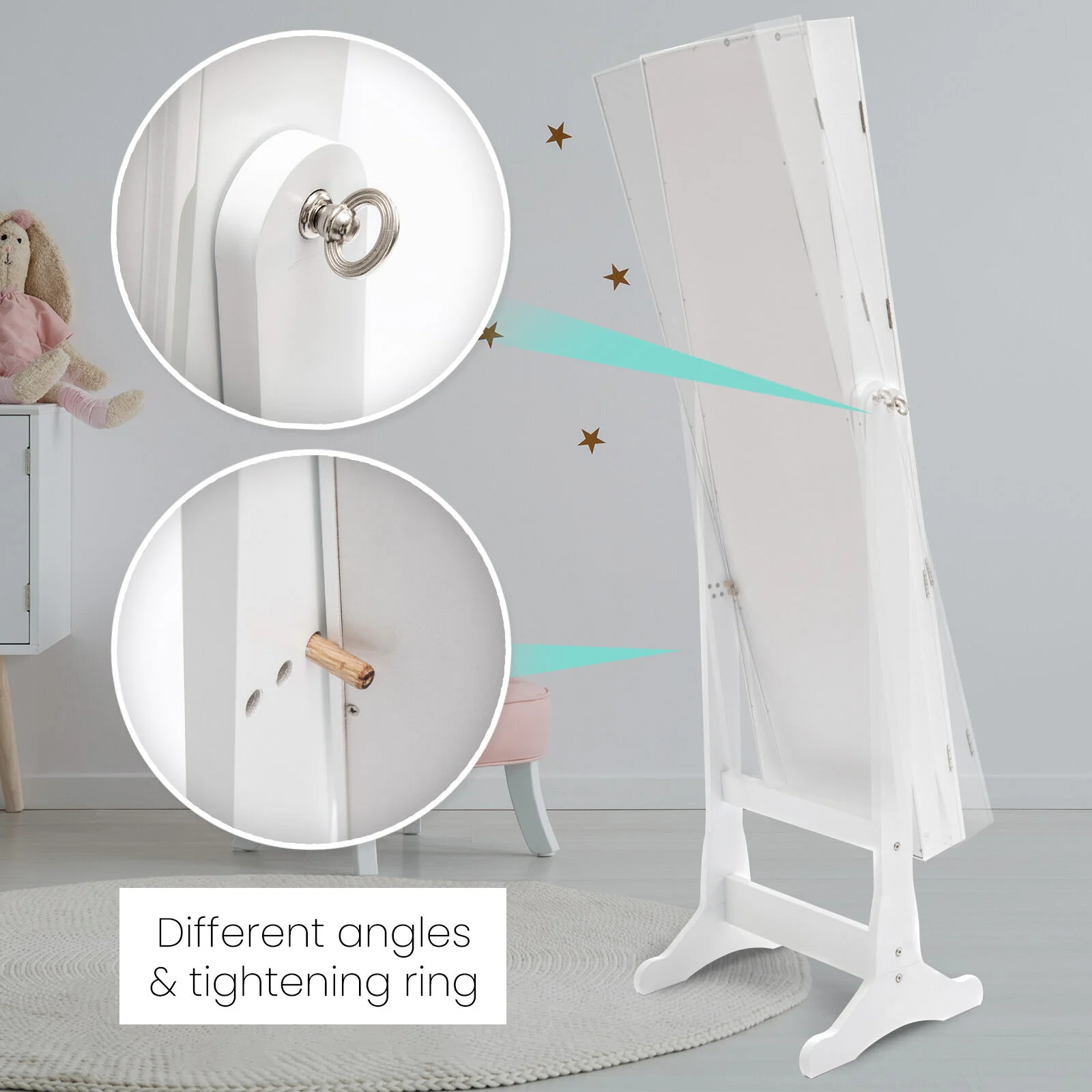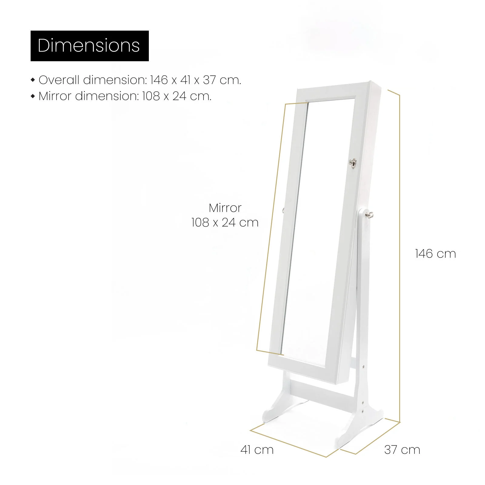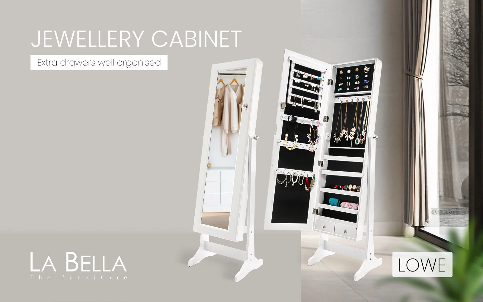 This high-quality La Bella LOWE Mirror Jewellery Cabinet is ideal for you if you need a compact and stylish storage option for your precious accessories! The mirror is a full-length dressing mirror so you can enjoy the convenience of having a mirror instantly available to check out how great your jewelleries fit with your dressing! It features 2 bottom drawers, more convenient for the storage. It will blend in well in any room and this is for sure a great solution if you want to keep your jewelleries and room tidy.