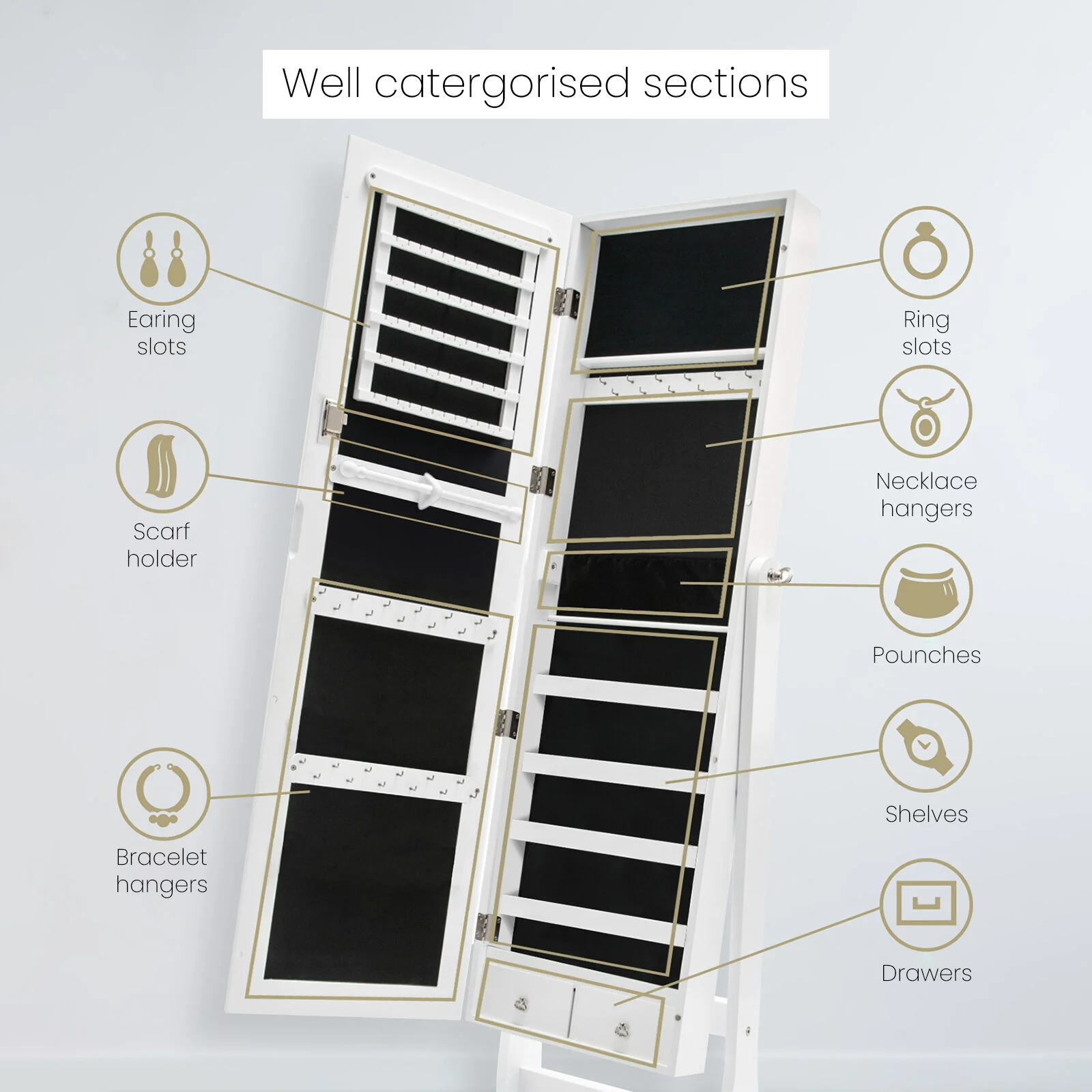 There are many earring hangers, necklace hooks, ring slots, and shelves to make it easier to separate and organise your precious jewelleries. You can certainly find many ways to arrange your accessories so you will be able to find a perfect way only for yourself! The black flock-lined interior will give your shiny jewelleries a nice contrast and under light, it will look even better!