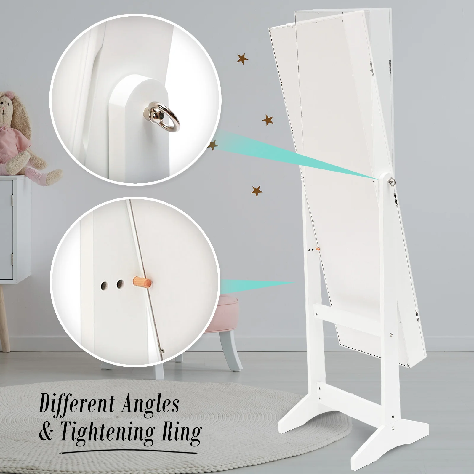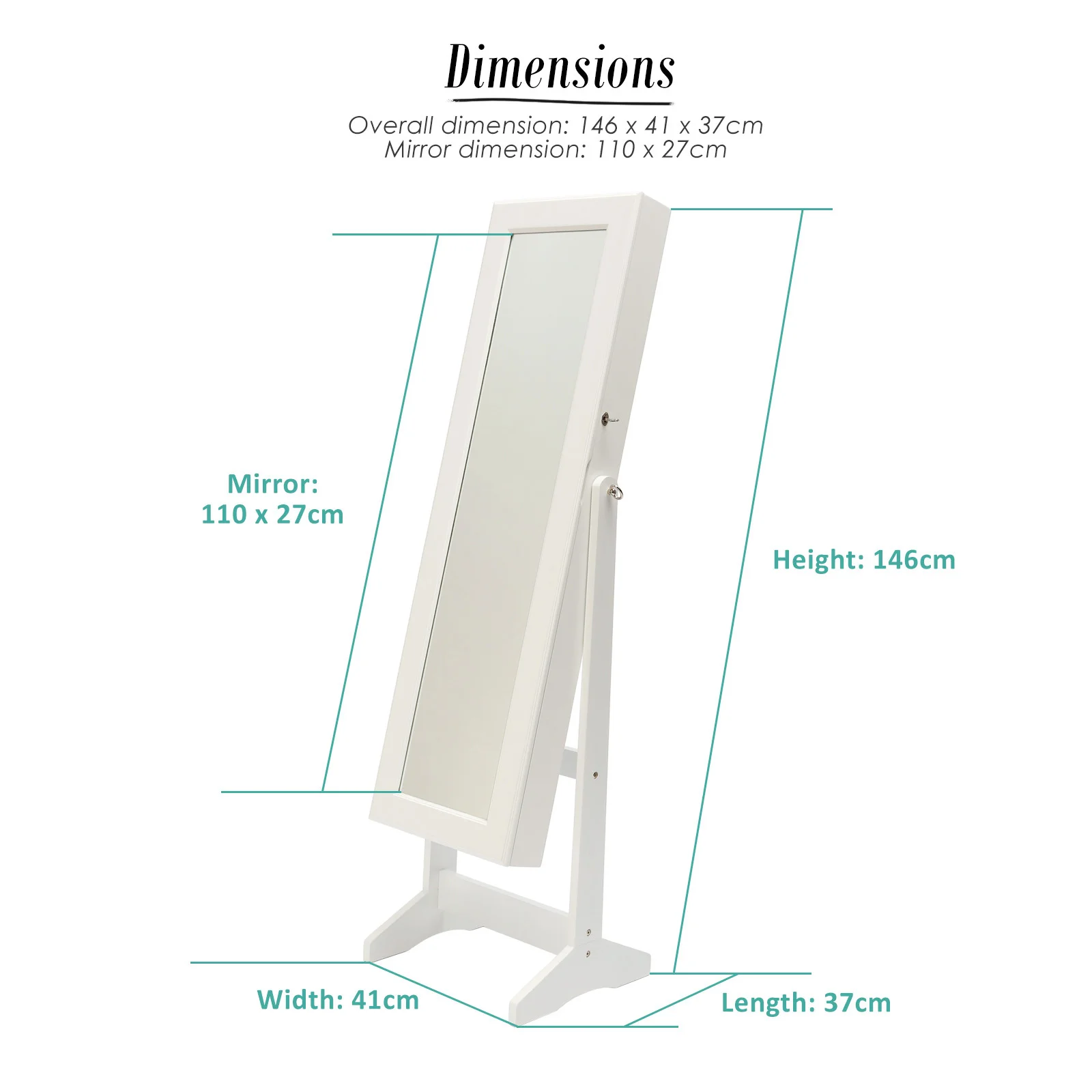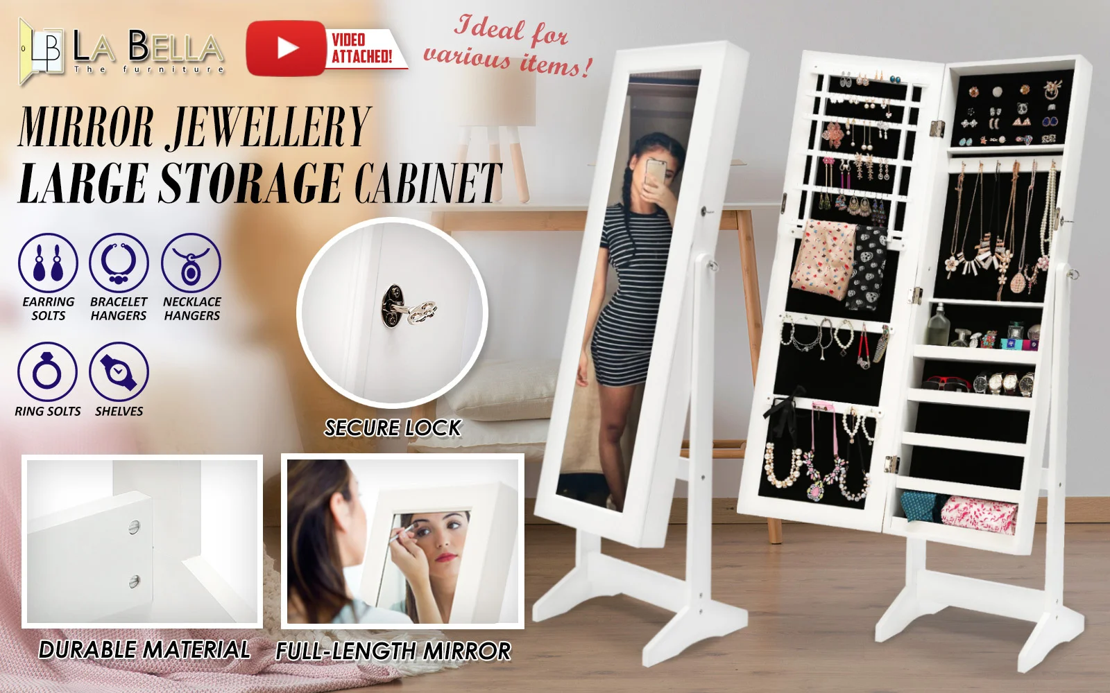 This high-quality La Bella LUVO White Multifunctional Mirror Jewellery Lockable Cabinet is ideal for you if you need a compact and stylish storage option for your precious accessories! The mirror is a full-length dressing mirror so you can enjoy the convenience of having a mirror instantly available to check out how great your jewelleries fit with your dressing! It will blend in well in any room and this is for sure a great solution if you want to keep your jewelleries and room tidy.