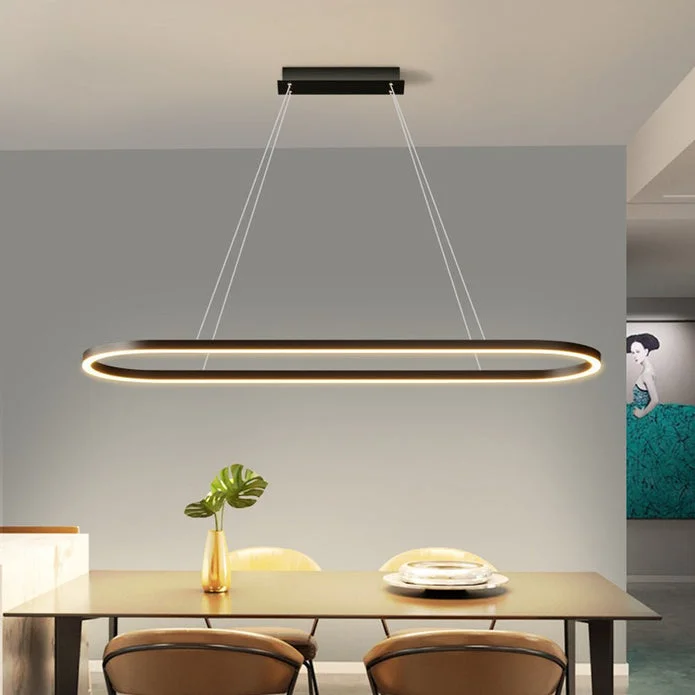Experience the elegance of modern design with our Modern Minimalist Oval Pendant Light. Perfect for dining rooms, bars, and offices, this creative chandelier features a sleek oval shape that embodies contemporary design principles, creating a strong spatial presence and a rich artistic ambiance. The fixture offers flicker-free, smooth, and natural lighting with three adjustable color temperatures: cool white, warm white, and warm yellow. Its adjustable suspension wire allows for versatility in placement at different ceiling heights. The high-transparency silicone lampshade ensures bright, energy-efficient LED light that accurately renders colors and protects your eyes. Constructed from durable iron, aluminum, and silicone with high-quality baking paint, perforation, and polishing processes, this pendant light is both stylish and built to last. Available in classic black and white colors.