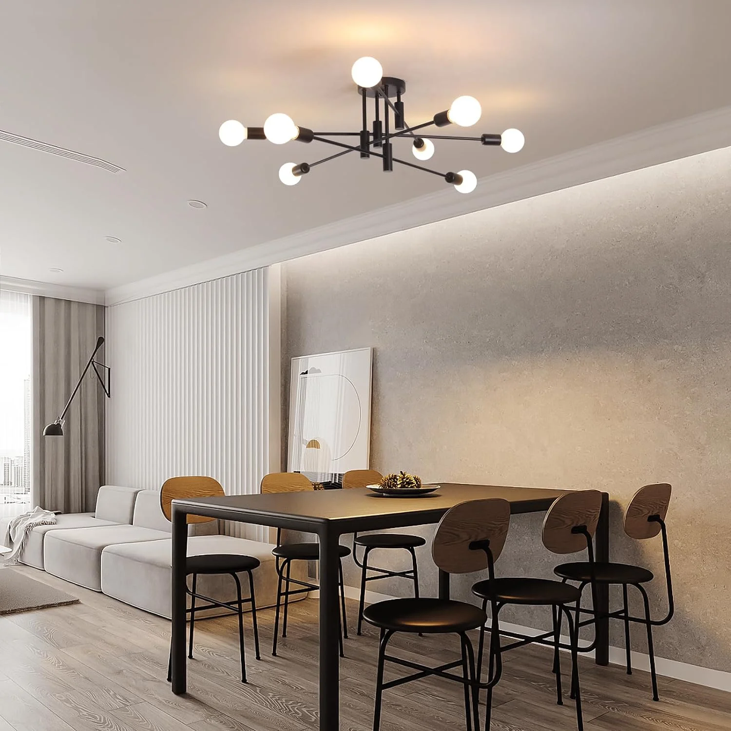 - This modern sputnik chandelier is the perfect way to add a touch of style and sophistication to your home. Its sleek design and contemporary look will bring a new level of elegance to any room.