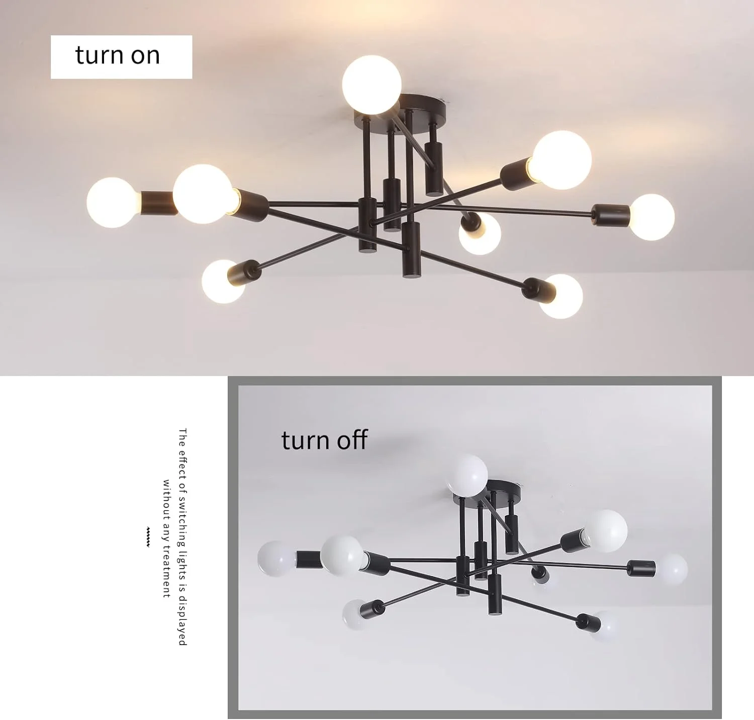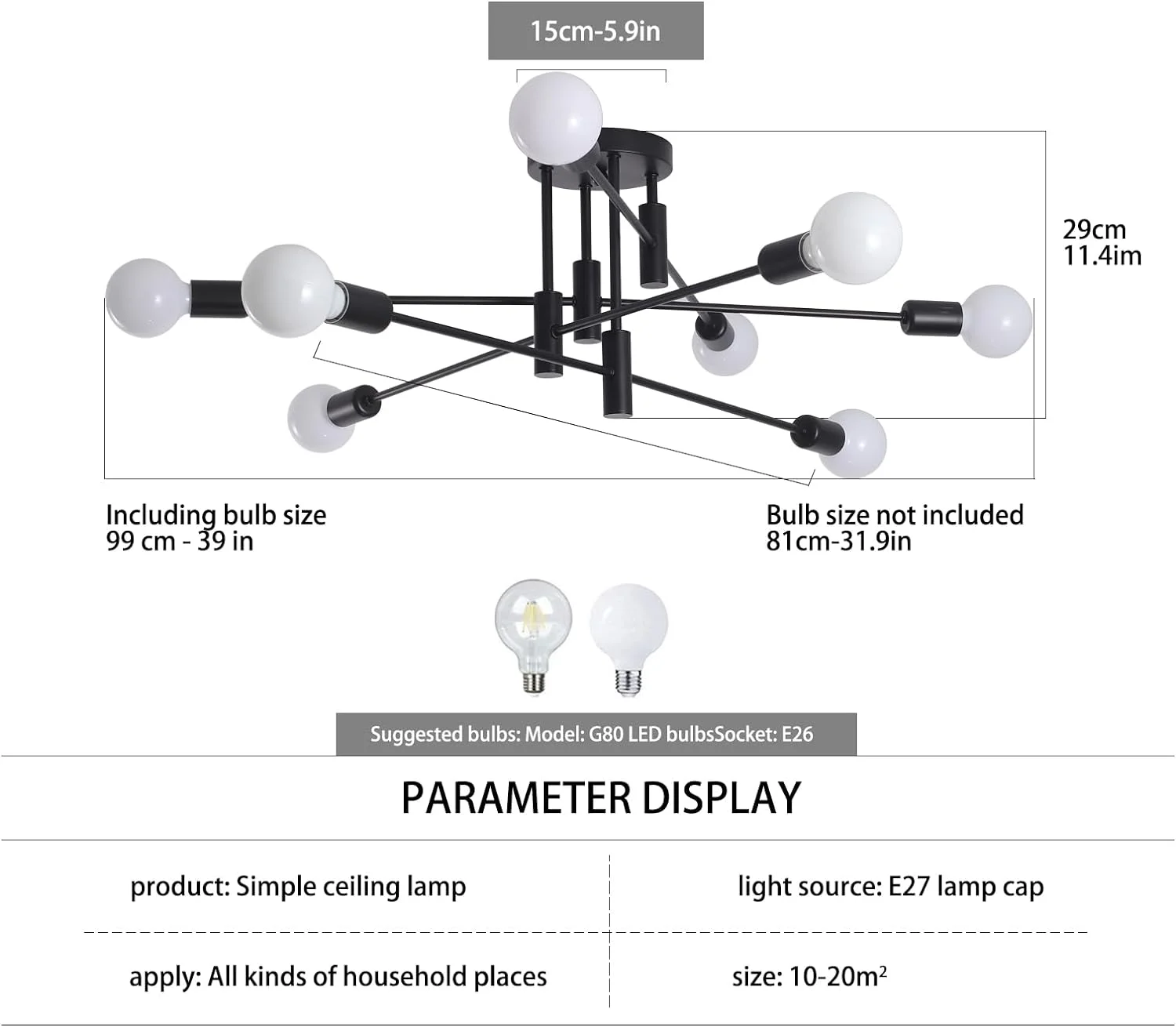 - This modern Sputnik chandelier offers 8 multi-directional lamp bases, 4 same length rods, and 4 adjustable arms that can be rotated to your desired angle. With a diameter of 31.9in/81cm and a fixture height of 29cm, this chandelier is sure to make a statement in any room. Plus, the 5.9in/15cm canopy ensures easy installation.