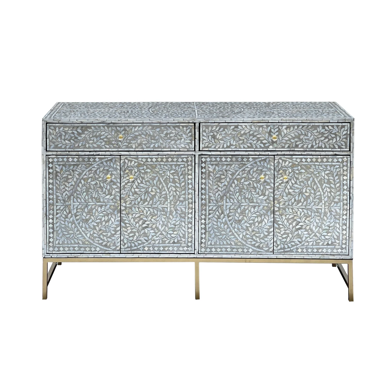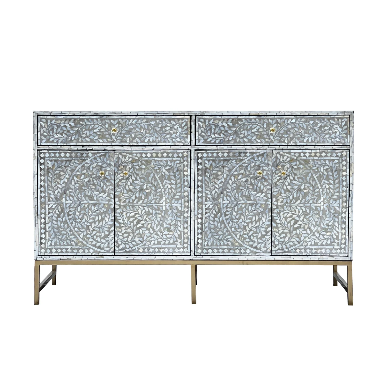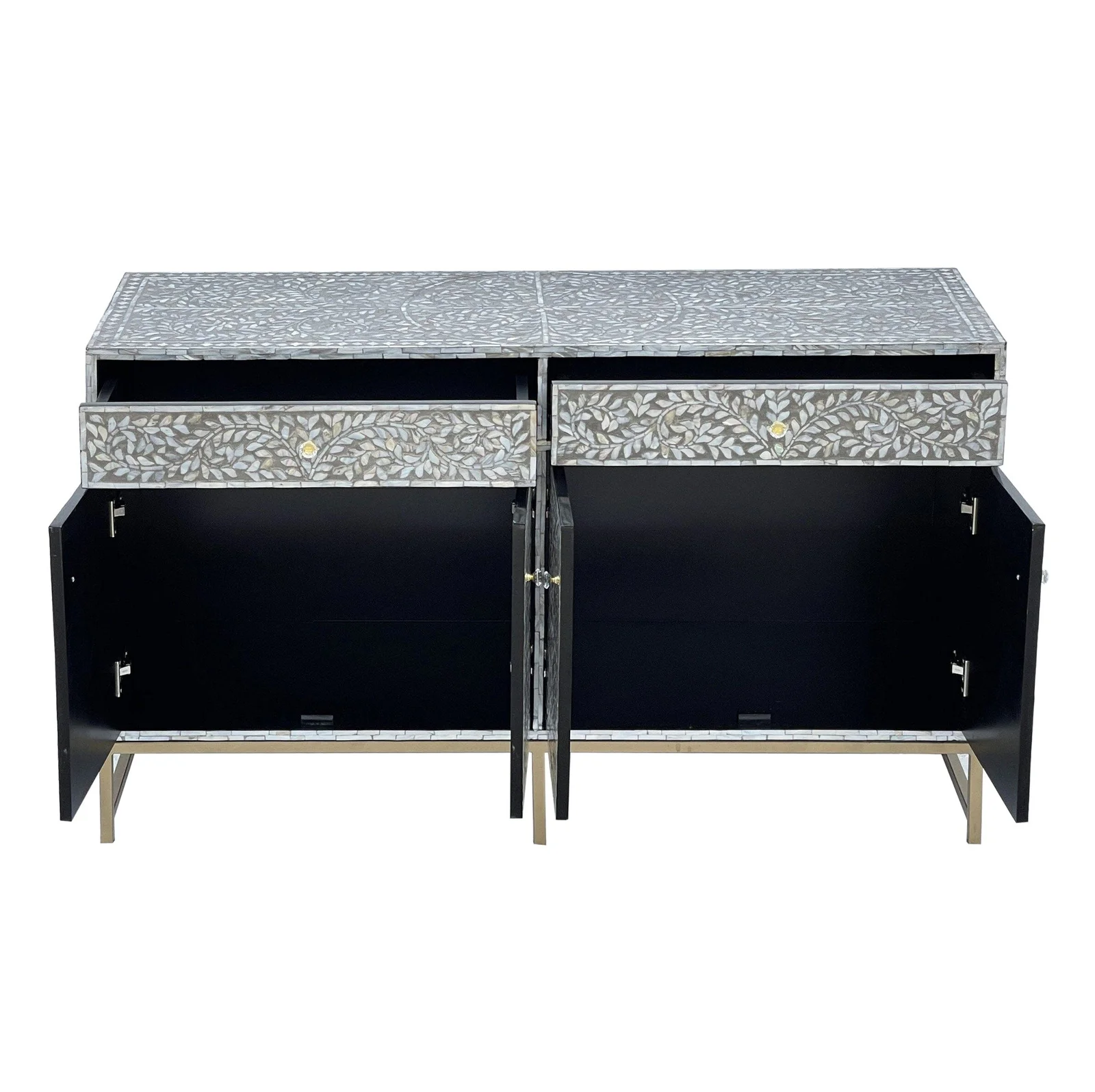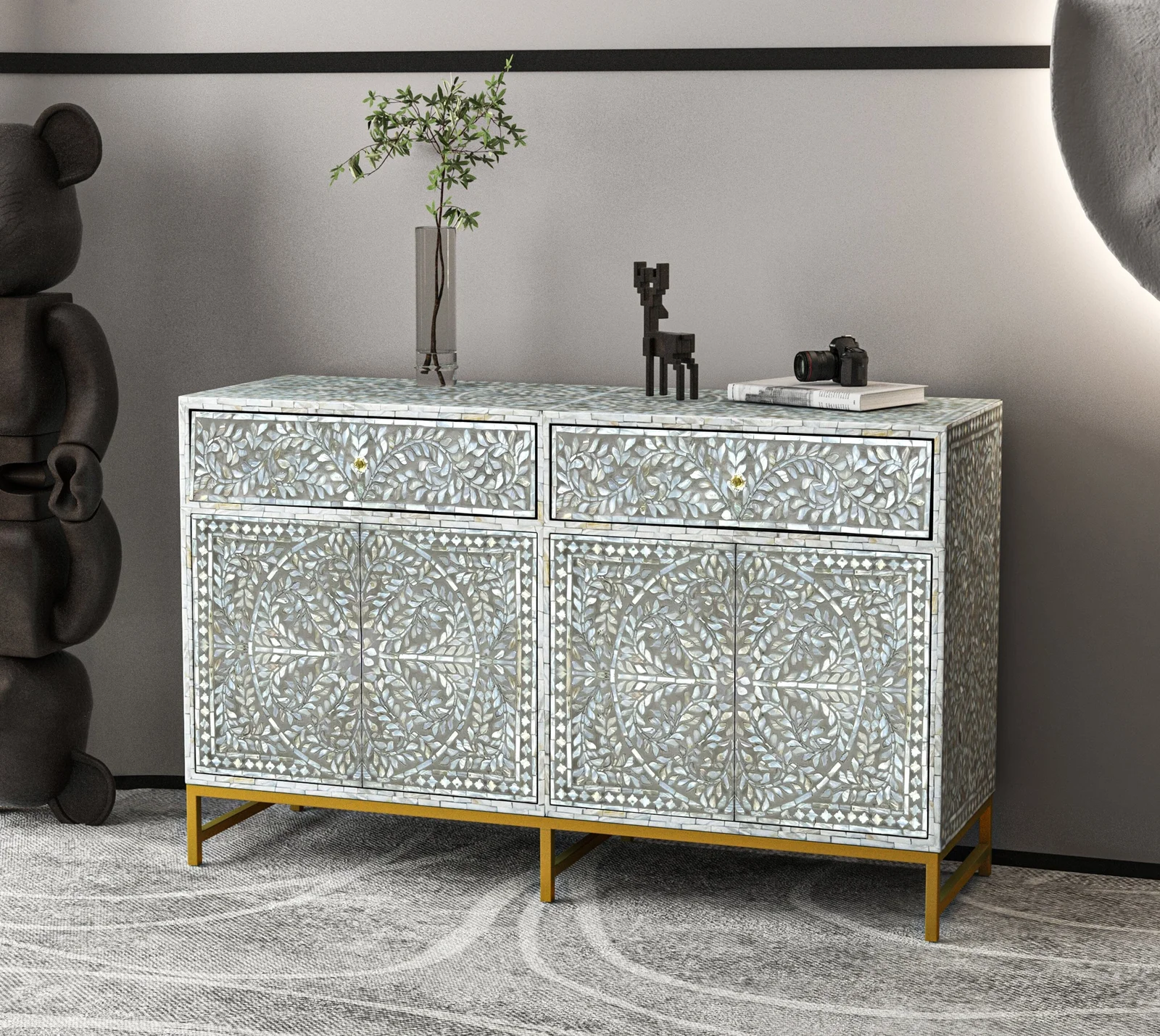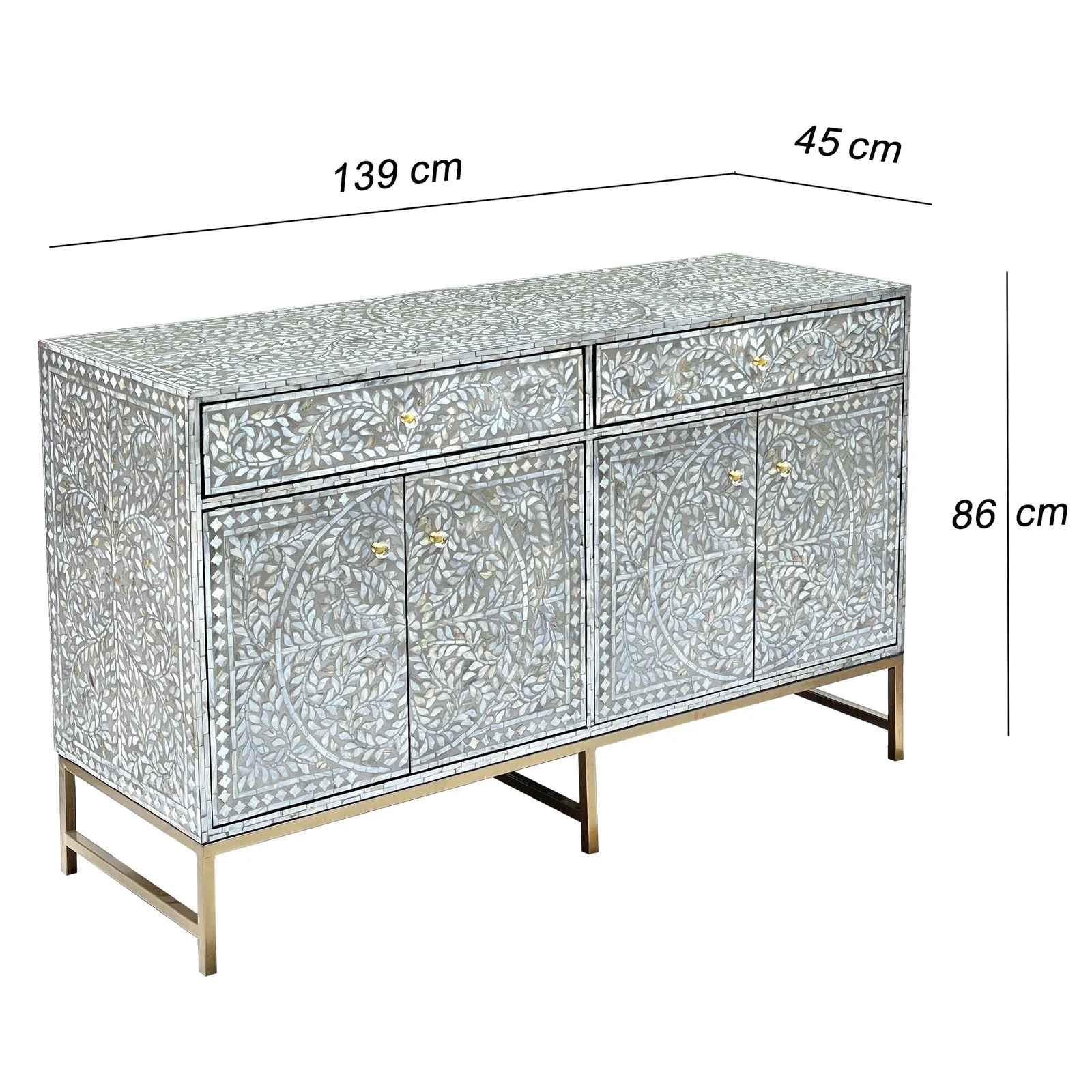 Indulge in the exquisite craftsmanship and sophistication of our MOTHER OF PEARL HAND MADE SWISH SIDEBOARD. Made with care and skill, this stunning piece exudes elegance and exclusivity.