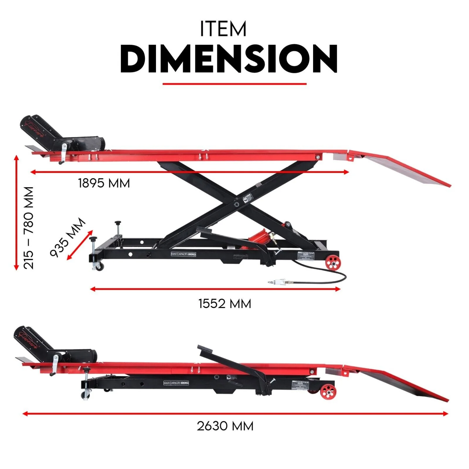 Our motorcycle hoist is made of durable and powder-coated steel. This is the perfect tool for hassle-free maintenance and repair with a platform size of 1895mm x 605mm.