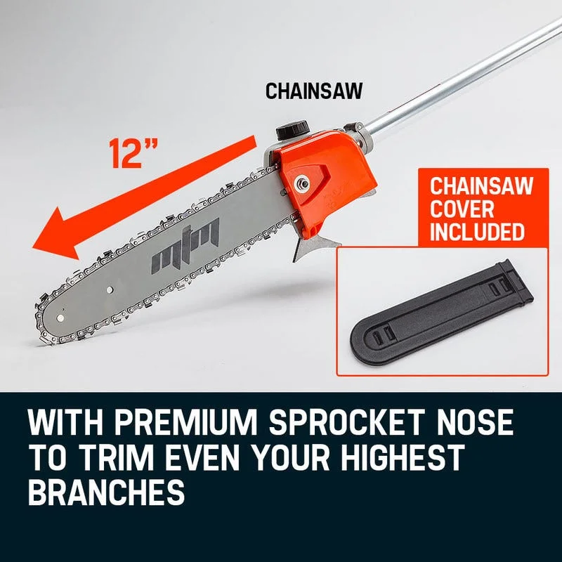 Loaded with no less thanseven attachments,theMTM-700 62cc Multi Pro-Seriesis the ultimate gardening machine. Adjust theextension poleand tackle those hard to reach branches with the class-leading power of its62CC engineand super responsive direction air injection carburettor. Add to this a great list of features including anauto chain lubricator, adjustable chain oil feed and MTM's exclusive 'Easy Start System'and you've got just the tool for any pruning or sculpting job.