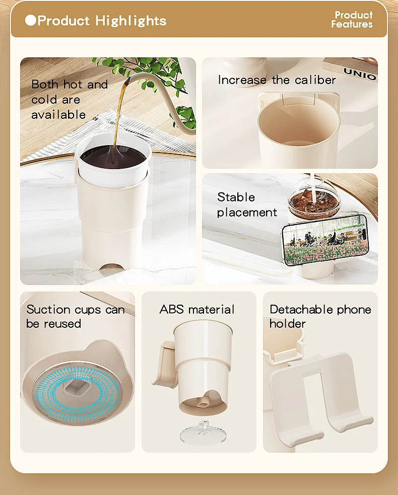 Prevent accidental spills and keep your essentials organized with this innovative Multi-Purpose Cup Holder. Featuring a powerful vacuum suction cup base, this holder firmly adheres to any flat, smooth surface, ensuring your drink remains stable and won't get knocked over. It's designed with a large-caliber opening to accommodate a wide variety of cup types, suitable for both hot and cold beverages. Made from thick, durable ABS material, it also includes a convenient detachable phone holder, allowing you to enjoy drinks while watching videos. This versatile item can also be used as a desktop organizer or pen holder, making it a perfect companion for your study, office, or leisure time. The reusable suction cup leaves no trace and can be repositioned as needed.