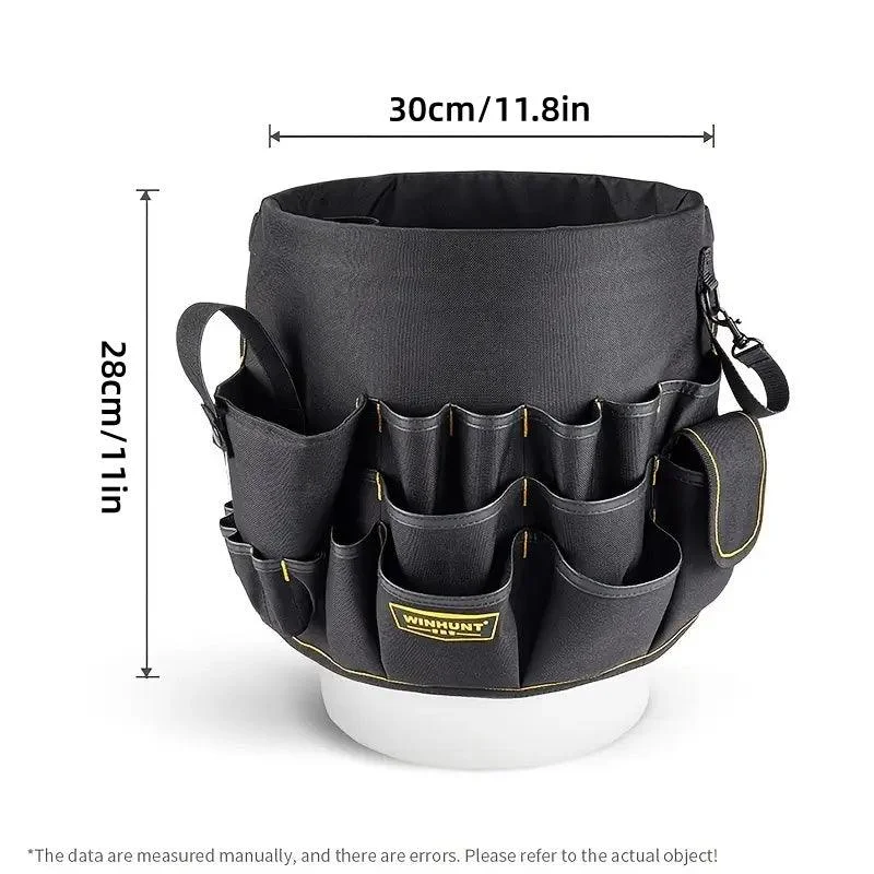 This bucket tool bag is the ideal solution for organizing and transporting your hardware tools. Designed to fit standard 5-gallon buckets (bucket not included), it features a sturdy construction with 600D high-density Oxford cloth, offering water resistance and exceptional durability. The bag boasts 56 pockets in various sizes, both inside and outside, providing ample storage for your tools and accessories. With its open-top design for quick access and secure tool loops, this bag is perfect for professionals and DIY enthusiasts alike.
