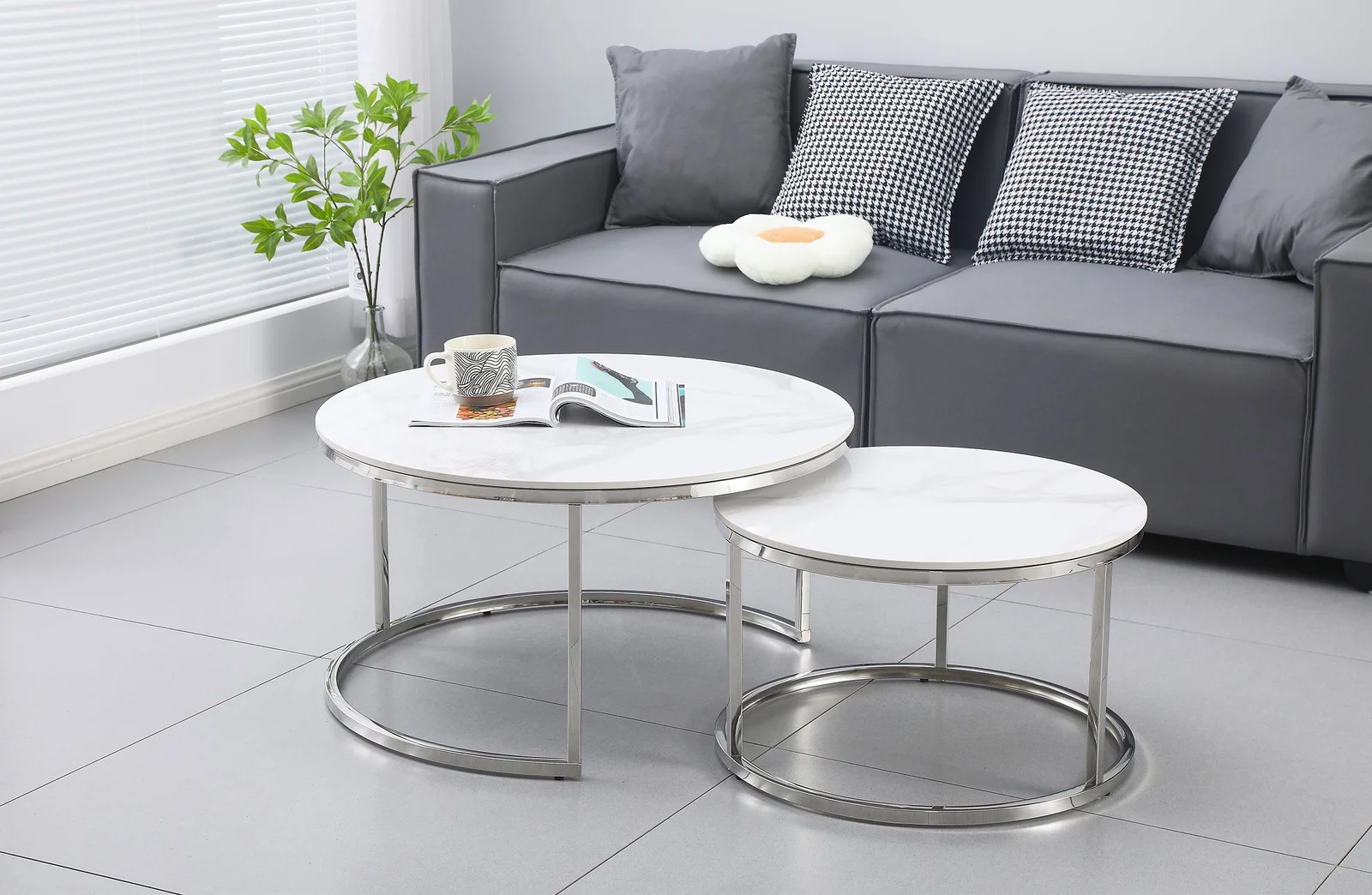 The Nesting Style Coffee Table in White on Silver Stainless Steel is a stylish and functional piece of furniture that features a white marble top with a stainless steel frame finished in silver. The table comes in two sizes, with the smaller table fitting neatly underneath the larger one to save space when not in use. Each marble top finish might vary in pattern, making each piece unique.