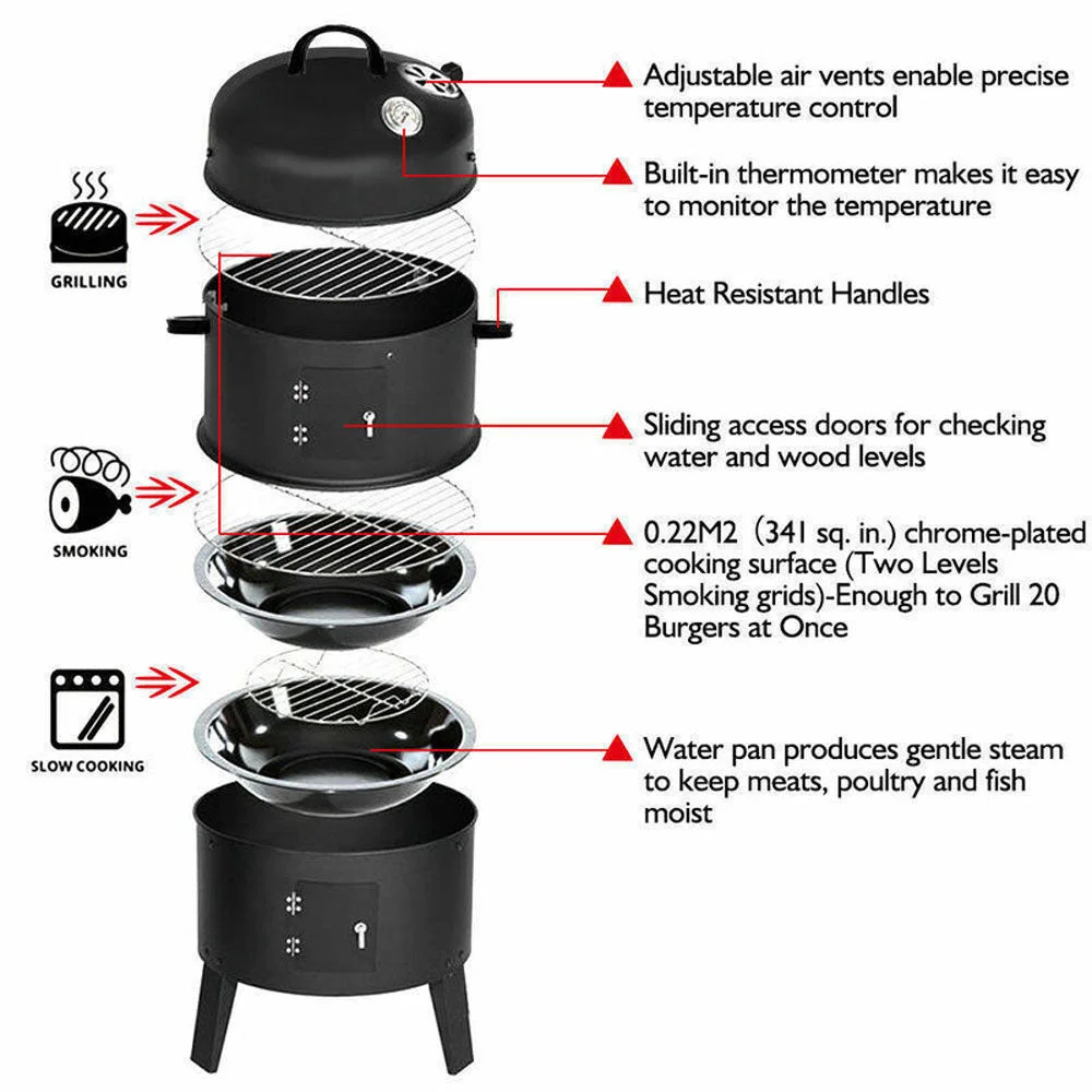 Corn on the cob, roasted lamb, kebabs, or grilled chicken the options are only limited by your culinary imagination! This 3 in 1 smoker and grill BBQ is so compact yet full of features to make cooking outside for friends and family a thrill. You'll love the flavors you can add to your meats and vegetables by incorporating the smoker or getting a good char on your meats from the charcoal grill. Made from heavy-duty steel, the BBQ features a scald proof handle, stand, temperature display, stainless steel grill plate, shelf, and chimney all in one. Great for parties, family feasts and entertaining all year round!