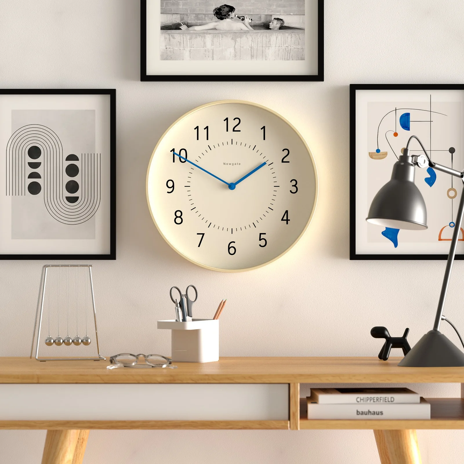Newgate Monopoly Plywood Wall Clock With Blue Hands A Scandi wall clock with a modern pale plywood case and a minimalist graphic dial, with colourful blue hands. Ideal within a contemporary interior this large wood wall clock creates a modern focal point in the kitchen, living room or office.