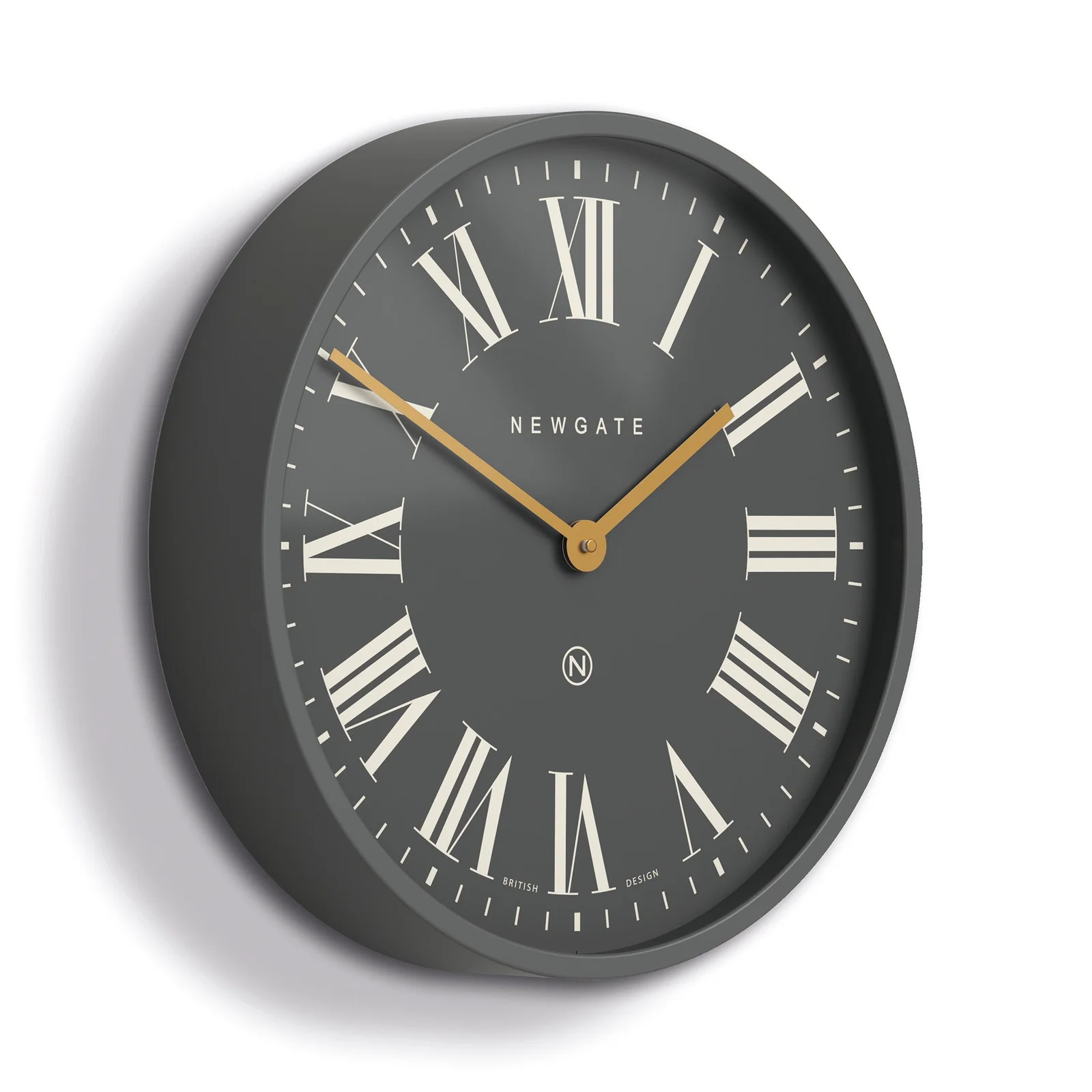 Newgate Mr Butler Wall Clock Moonstone Grey Reverse Dial A large grey wall clock with a classic Roman numeral dial on a 'Moonstone Grey' face and a contemporary matt grey case.