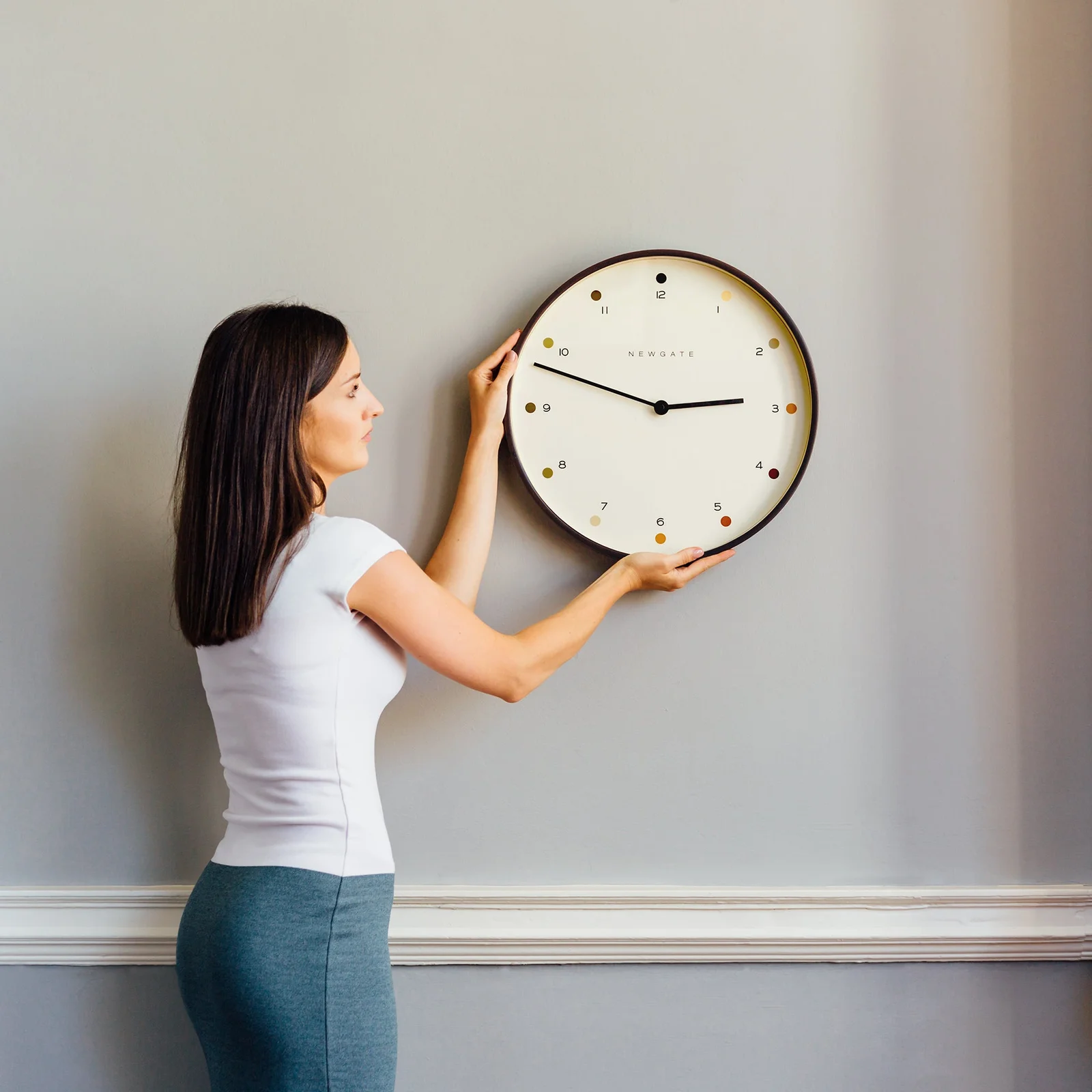 Newgate Mr Clarke Clock Dark Wood Dot Dial 40 A large dark plywood wall clock with a modern shaded dot dial.