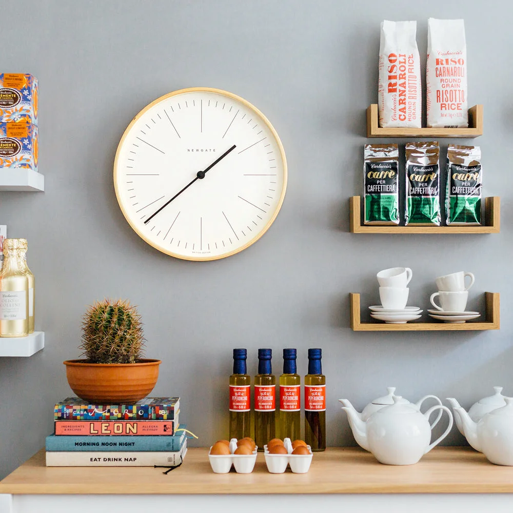 Newgate Mr Clarke Clock Pale Wood Marker Dial 40 A large Scandi-inspired wall clock with a modern pale plywood case and a minimalist marker dial. Ideal within a contemporary interior this large wood wall clock creates a modern focal point in the kitchen, living room or office.