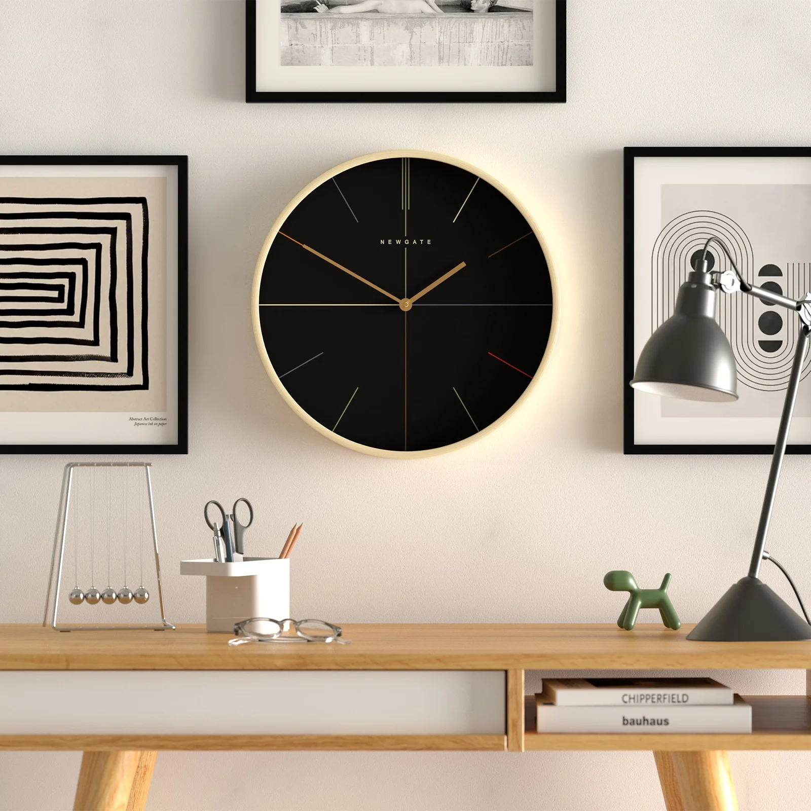 A large modern wall clock in a pale plywood case, with a colour marker dial and contrasting gold hands.