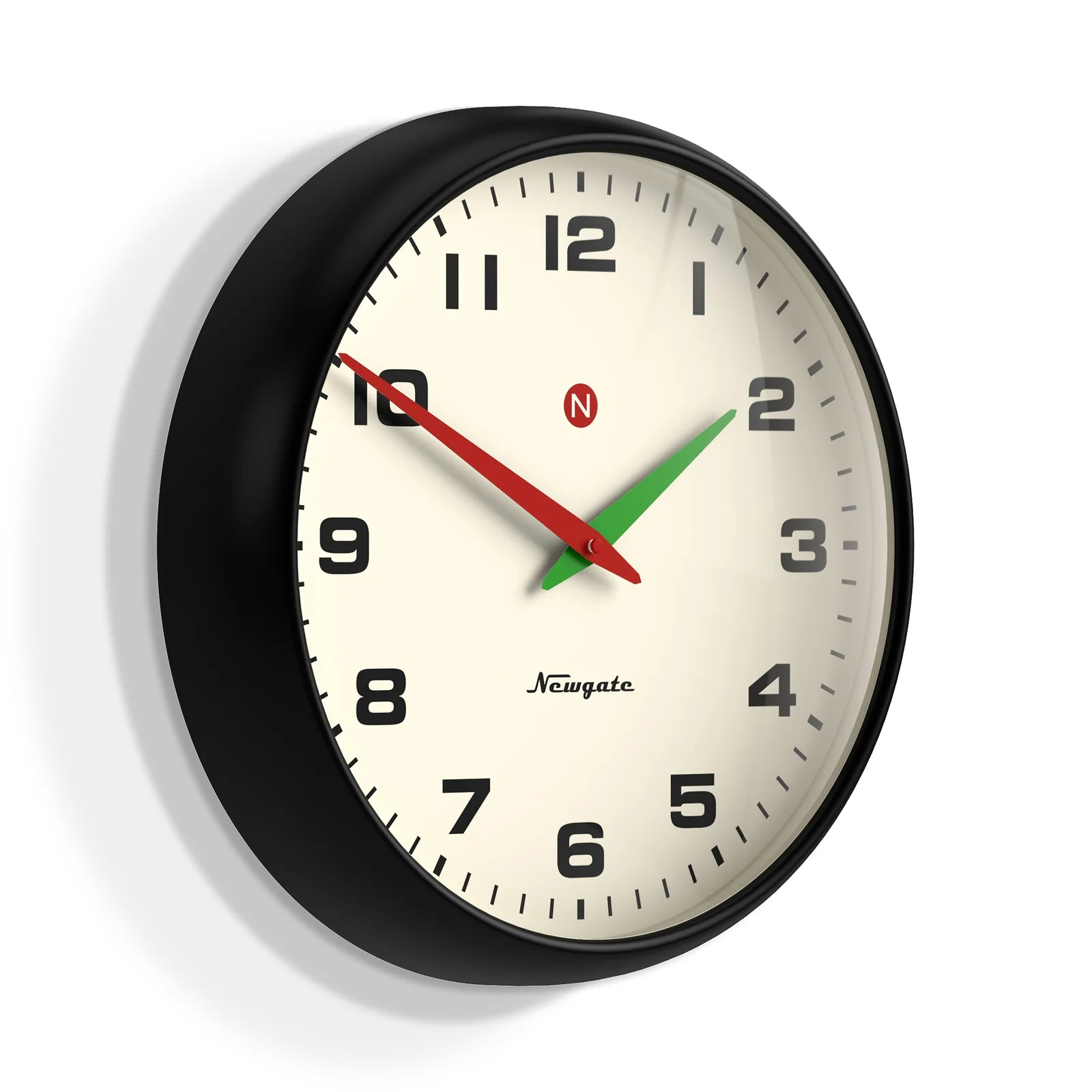 Newgate Superstore Wall Clock Alpha Dial Black A large retro-style wall clock with a matt black case and contrasting red and green hands.