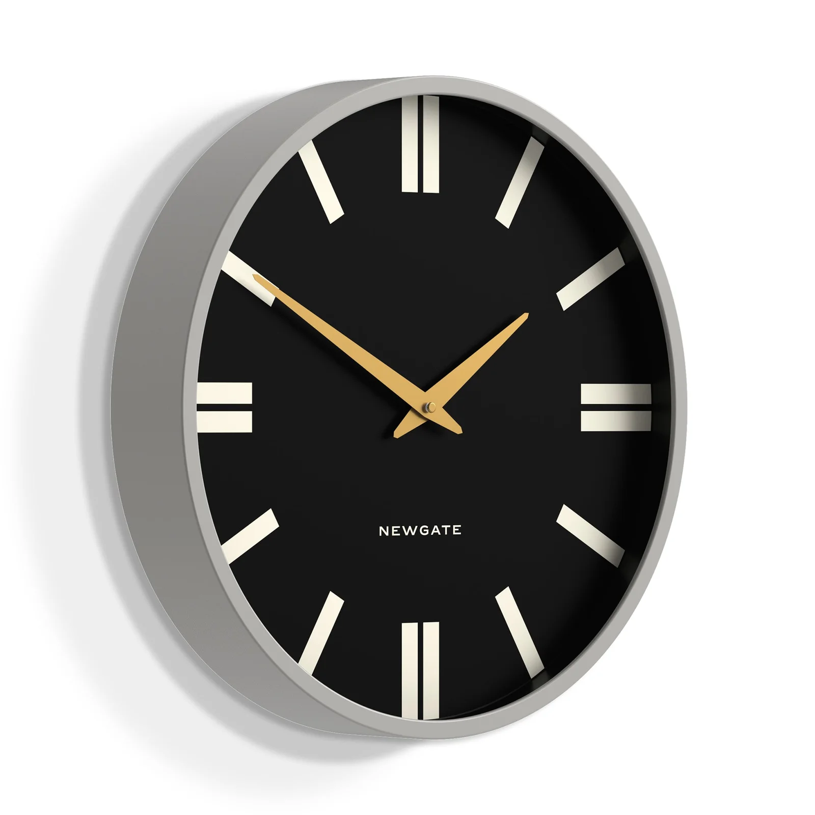 Newgate Universal Wall Clock Plaza Dial Grey A large grey wall clock with a bold black marker dial, contrasting gold hands and a deep straight-cut metal case.