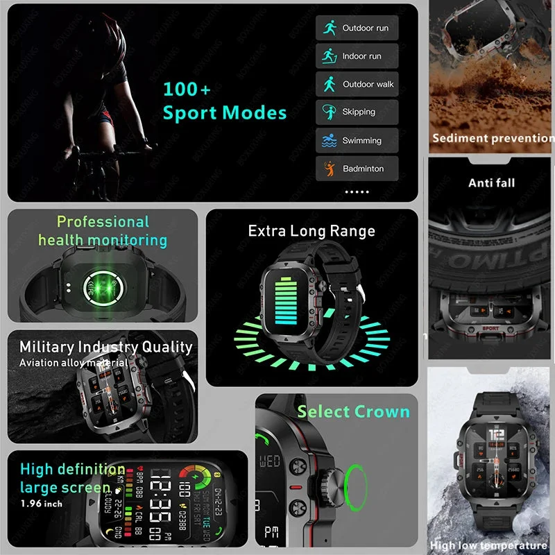 Elevate your adventure with the Rugged Military GPS Smart Watch. Featuring a 1.96" AMOLED HD display, comprehensive health monitoring, Bluetooth calling, and robust waterproof capabilities, it’s the ultimate companion for outdoor sports and daily life.