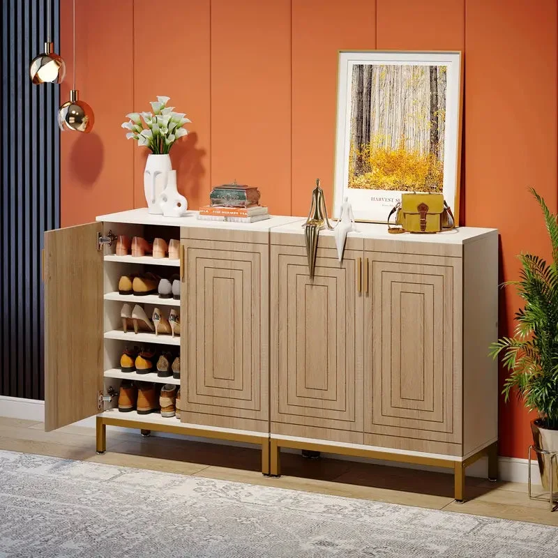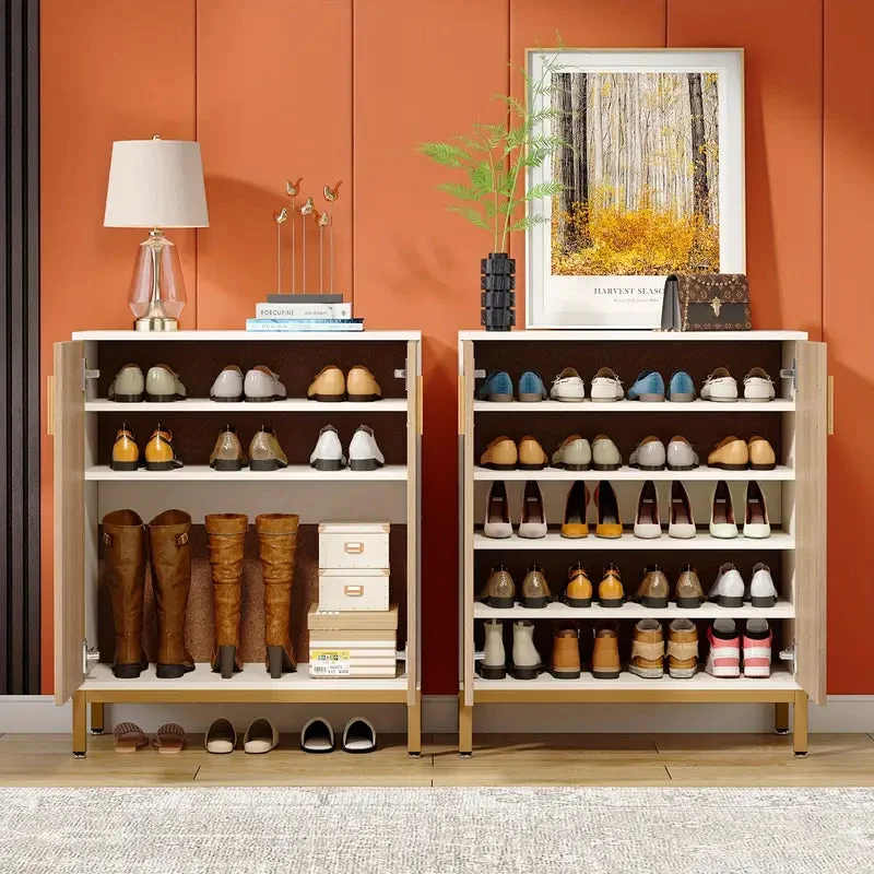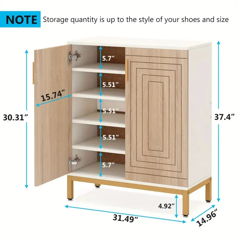 Measuring 31.5" W x 15" D x 30.3" H, this shoe rack saves valuable floor space while providing ample storage. The adjustable feet ensure the cabinet remains stable on any floor surface, preventing wobbling. The sleek golden door handle adds a warm touch and protects against scratches and injuries during use.