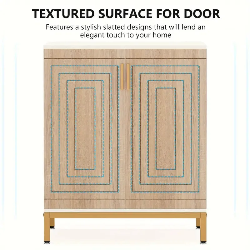 The high metal legs in gold not only add a touch of elegance but also make cleaning under the cabinet easy and convenient. The removable shelves inside allow for versatile storage, accommodating shoes of different heights and large sizes. The top of the cabinet can be used for decoration or storing daily essentials, while the bottom provides extra space for additional shoes.